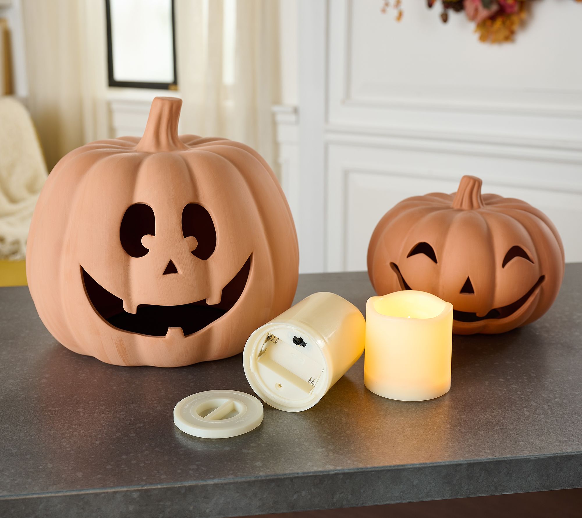Includes two jack-o'-lanterns, each with battery-operated candles
