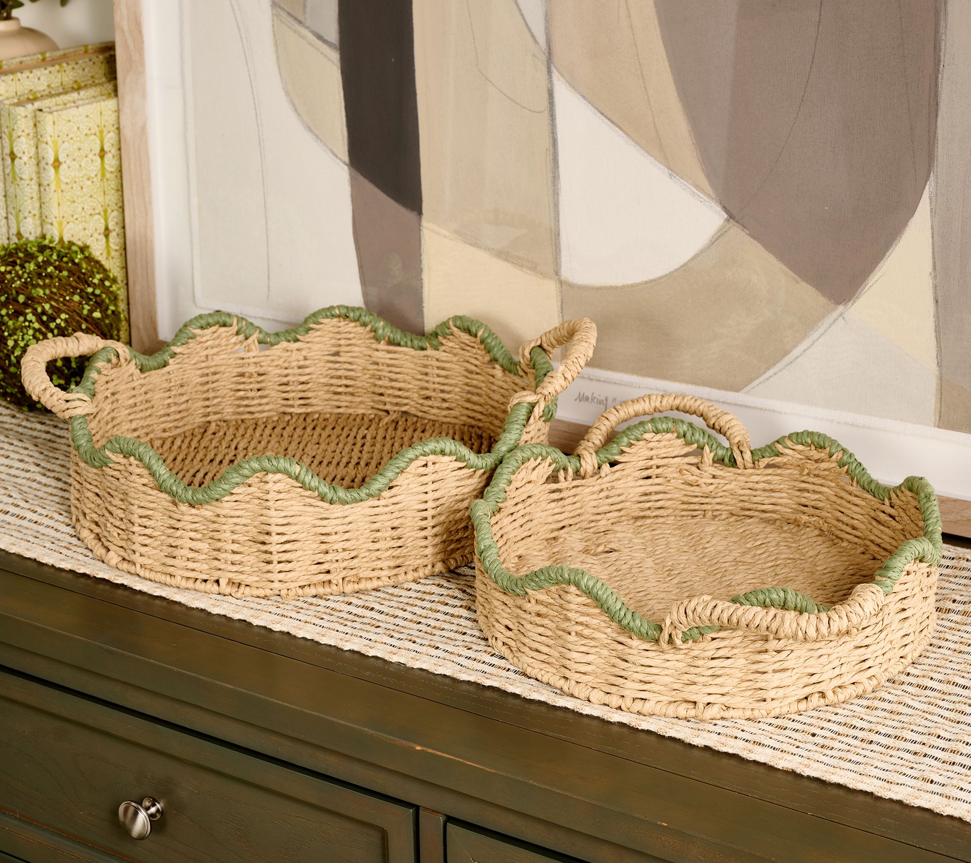 Whether you're arranging keepsakes in your entryway or organizing beauty supplies in the bathroom, these scalloped basket trays bring style and practicality to your everyday spaces. The nesting design allows you to easily tuck the smaller tray inside the larger when not in use, while the textured paper string finish adds a touch of charm to tabletops or shelves. From Home Reflections®.