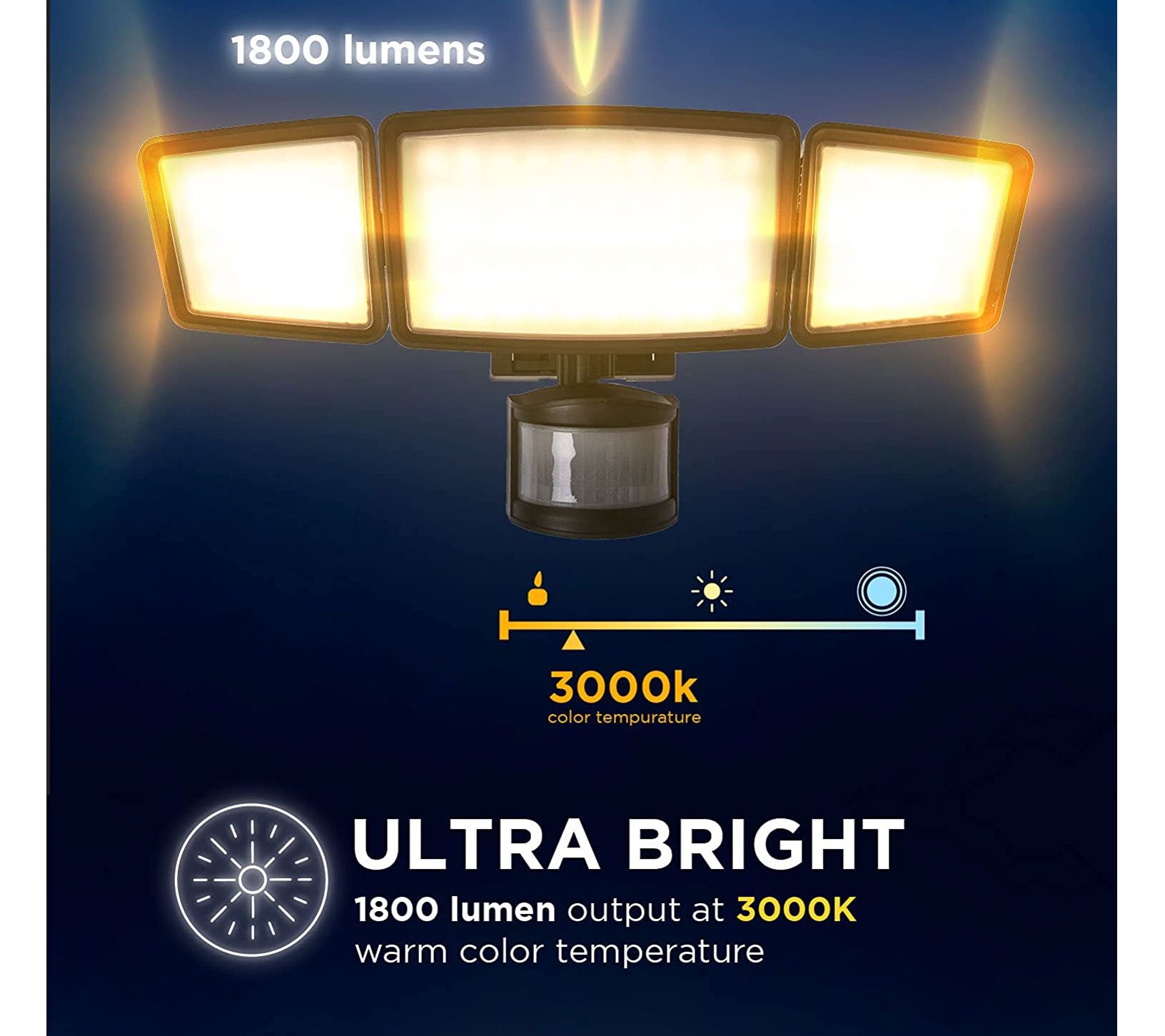 • Three adjustable LED light heads with up to 1,800 lumens of 3,500K warm light