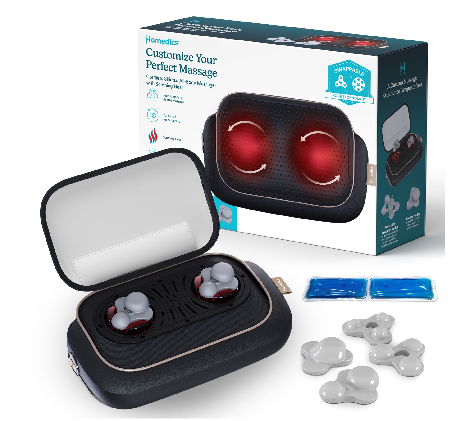 Tension fades when relief is just a button away, thanks to the HoMedics All-Body Shiatsu Adjustable Massager with Heat. You can switch between deep-kneading or gentle massage nodes, while soothing heat adds extra comfort for back, neck, shoulders, or legs. Rechargeable and cordless design lets you enjoy customized relaxation wherever you are. From HoMedics.