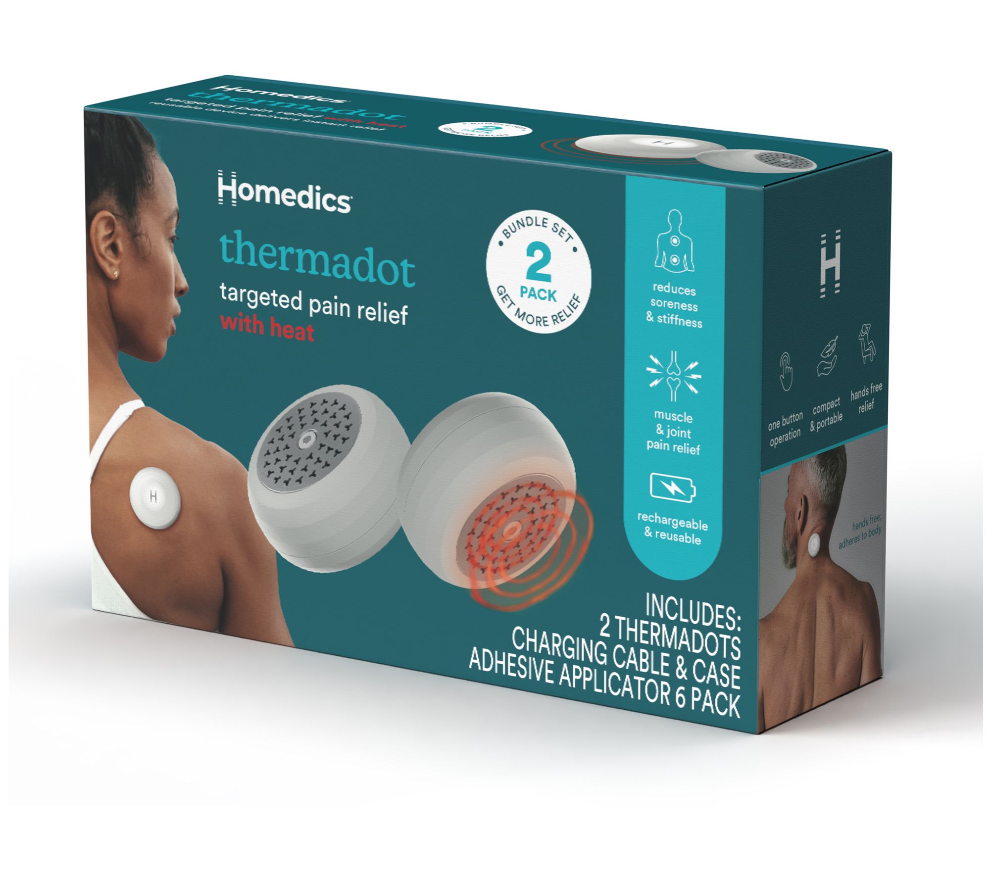 Help relieve minor muscle aches and pains with this set of two HoMedics ThermoDot pods. These rechargeable heat therapy pods can be easily placed on your back, shoulders, arms, or legs for temporary relief exactly where you need it. With a simple one-touch operation and three heat levels, you can customize your therapy to your comfort level. From HoMedics.