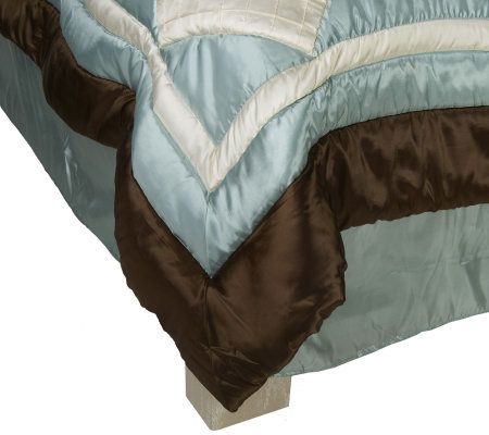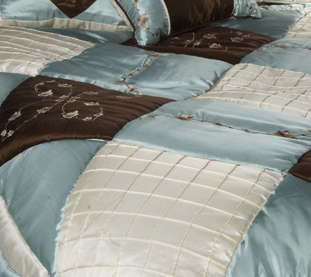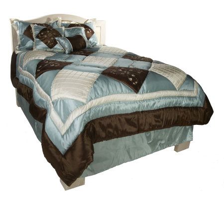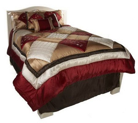 Includes embroidered pieced comforter, two shams, 18" x 18" pillow, 16" x 16" pillow, 12" x 18" pillow, and bed skirt