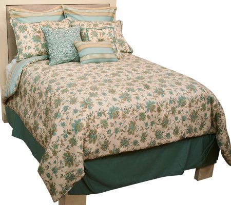 Includes one comforter, two King-sized shams, two Euro shams, one square pillow, one square embroidered pillow, one button pillow, and one bed skirt