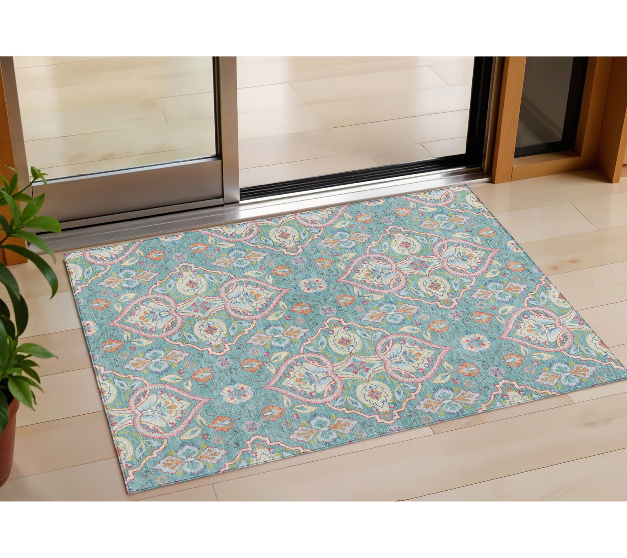A lively mix of teal blue, pink, and orange brings a welcoming touch to any space -- indoors or out -- with this ogee-patterned area rug. Featuring a soft, comfortable texture and versatile rectangular shape, it's a great way to brighten up a living room, porch, or patio and stands up well to busy households with kids or pets. From HomeRoots.