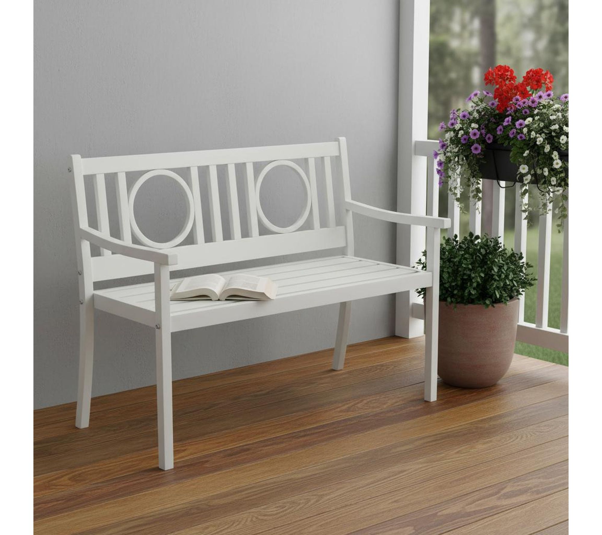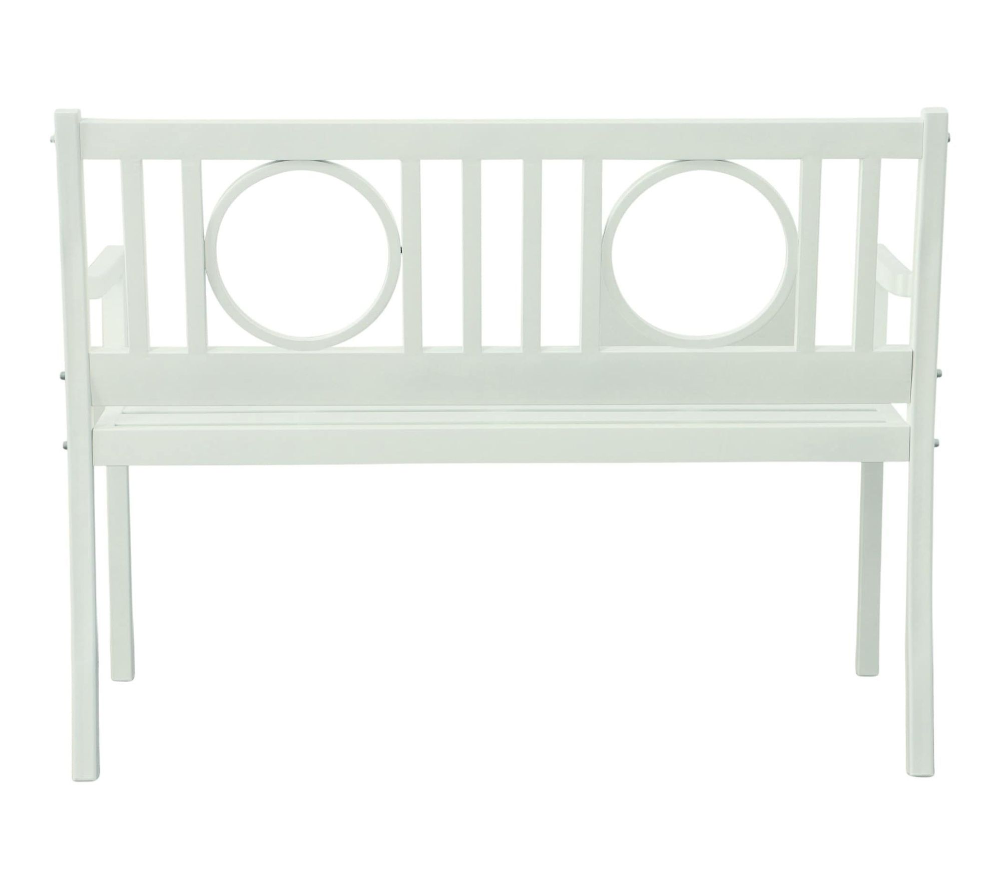 Take a moment to relax and enjoy sunny afternoons or evening conversations from the comfort of this garden patio bench. With geometric details and a crisp white finish, this metal bench adds casually elegant charm to your porch, deck, or favorite spot outdoors, creating a welcoming place to unwind. From HomeRoots.