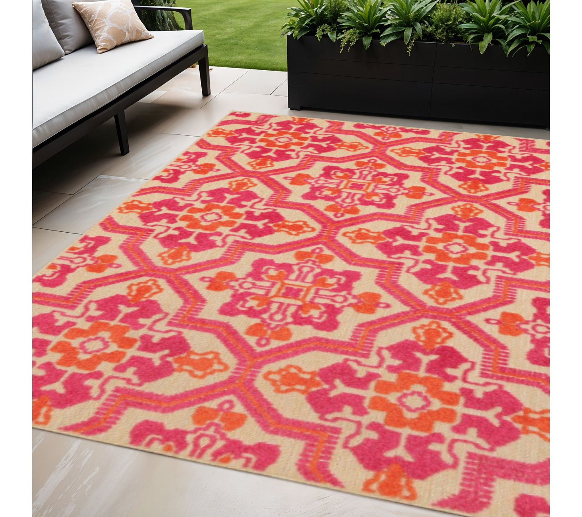 Vibrant pink and orange tones bring a lively touch to any space with this decorative area rug, showcasing a Moroccan-inspired quatrefoil design. Power loomed from durable polypropylene, it stands up to busy households and brightens everything from indoor living areas to your patio or poolside. Easy to clean for everyday convenience. From HomeRoots.