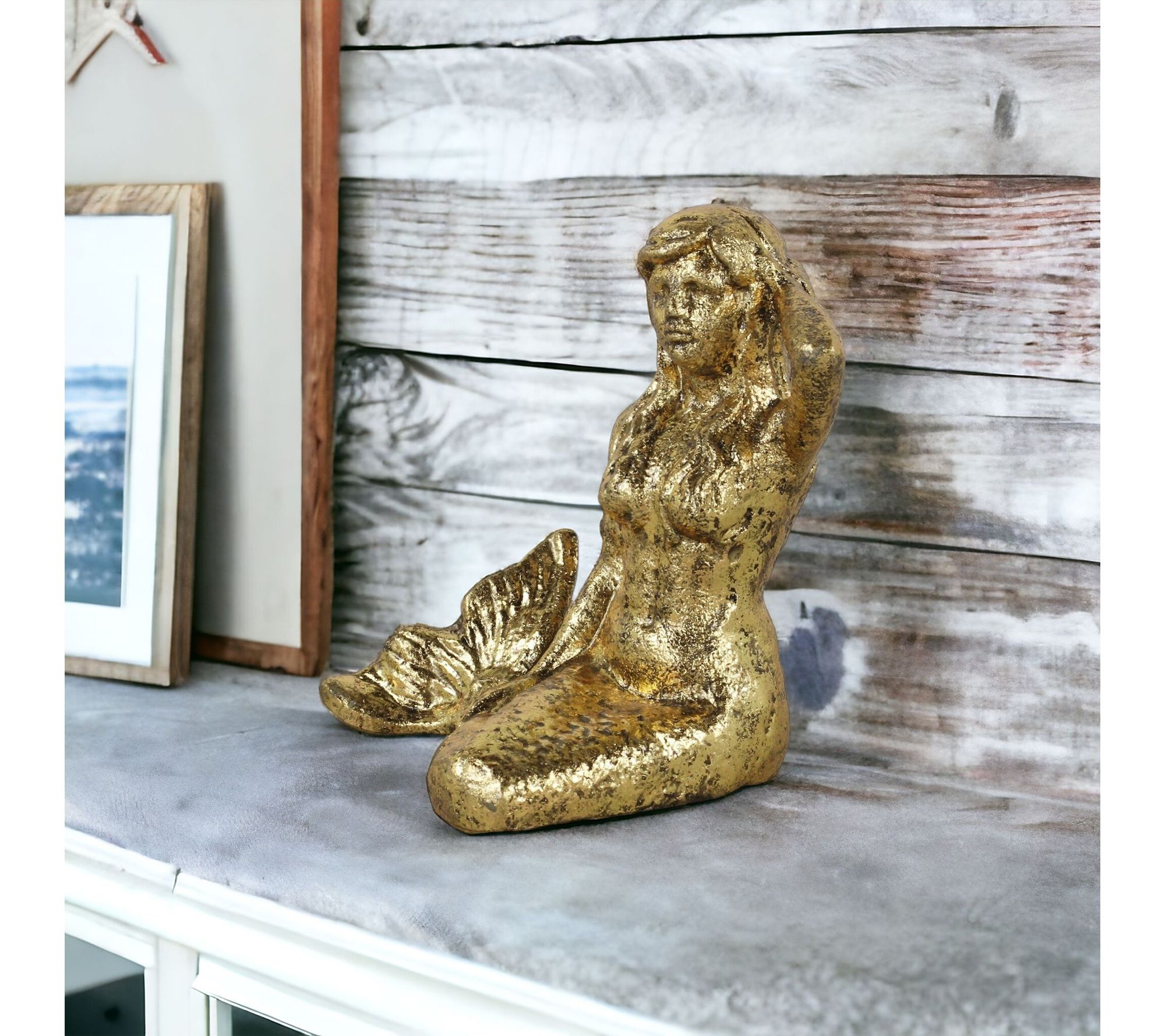 Mermaids and coastal charm come alive with this decorative accent, bringing a bit of whimsy to your bookshelf or coffee table. The distressed gold and cast iron construction offer a stylish focal point, ideal for beach-inspired rooms or anyone looking to add a nautical touch to their space. From HomeRoots.