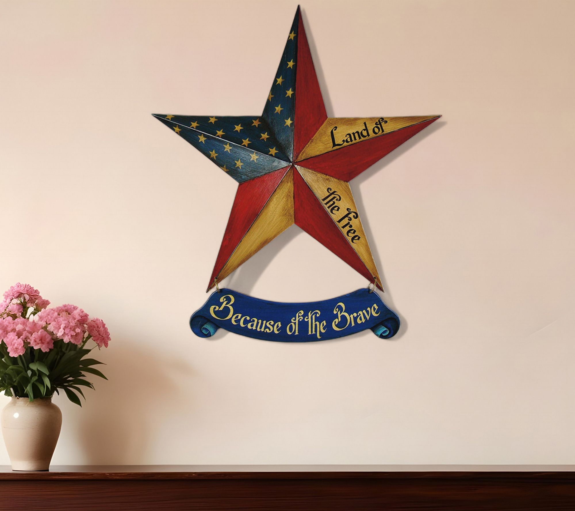 • Star is rust-free metal; banner is wood; hangs from a chain