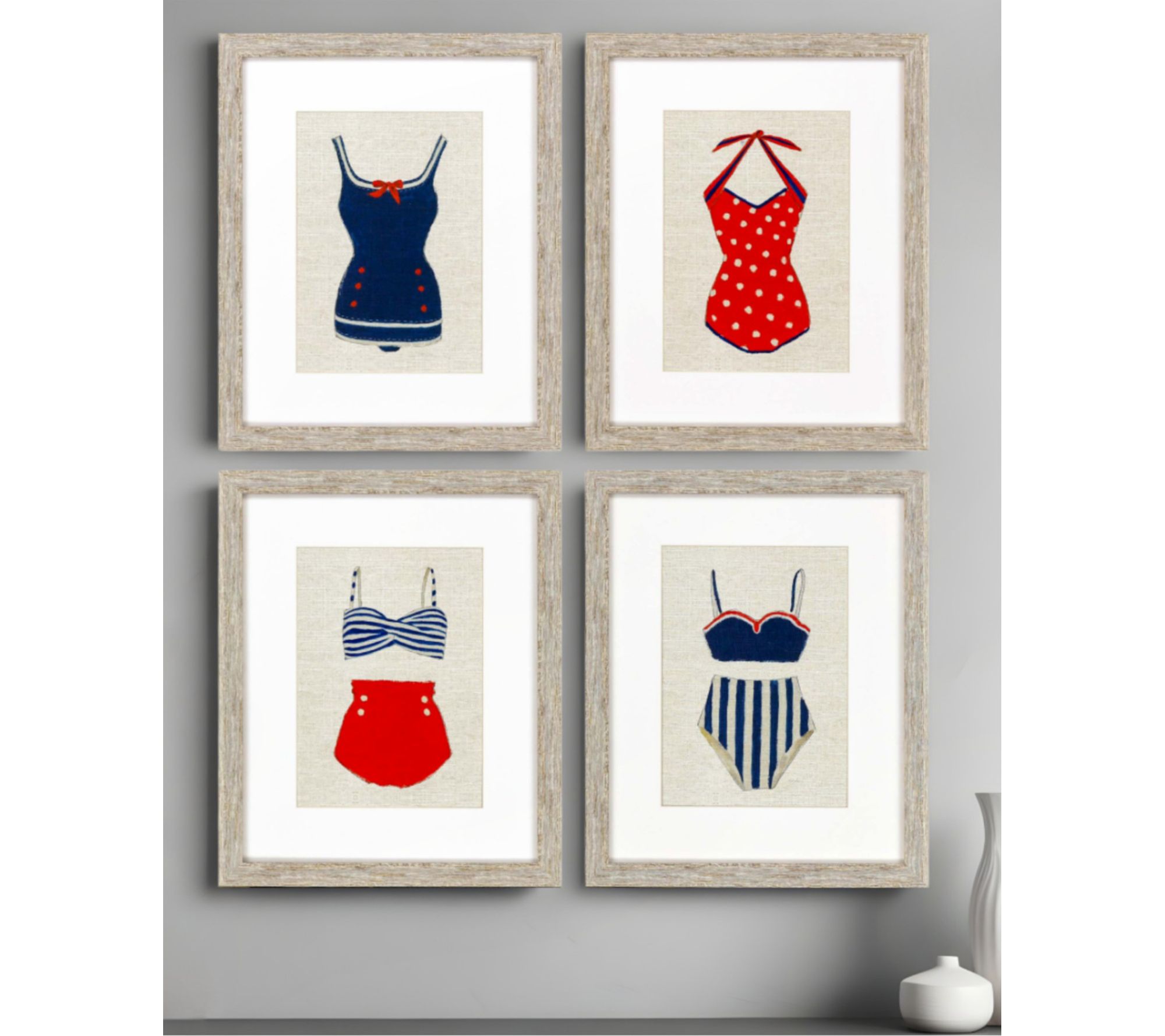 Showcase summer style all year with this set of four swimsuit wall art prints featuring vibrant red, white, and blue designs. Each piece brings playful nostalgia and a breezy, beachy vibe to living rooms, bedrooms, or a coastal-inspired entryway. From HomeRoots.