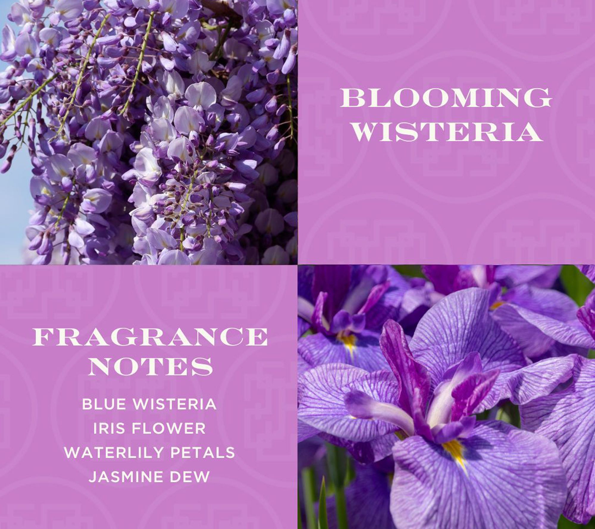 1st shipment scent: Blooming Wisteria -- notes of blue wisteria, iris flower, waterlily petals, and jasmine dew