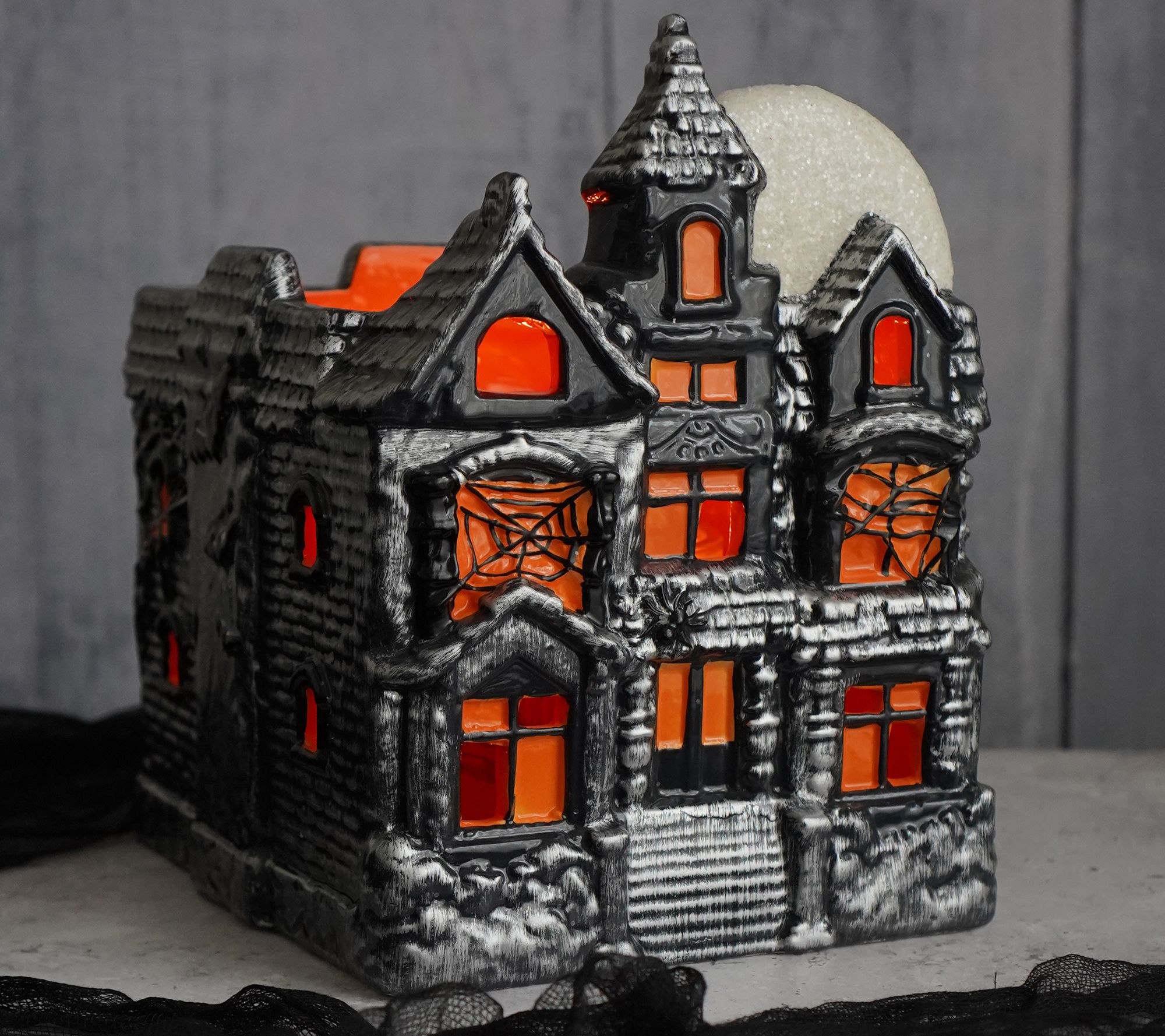 Illuminate your autumn nights with this spook-tacular haunted house luminary, an elaborate addition to your Halloween scene. From HomeWorx by Slatkin + Co.