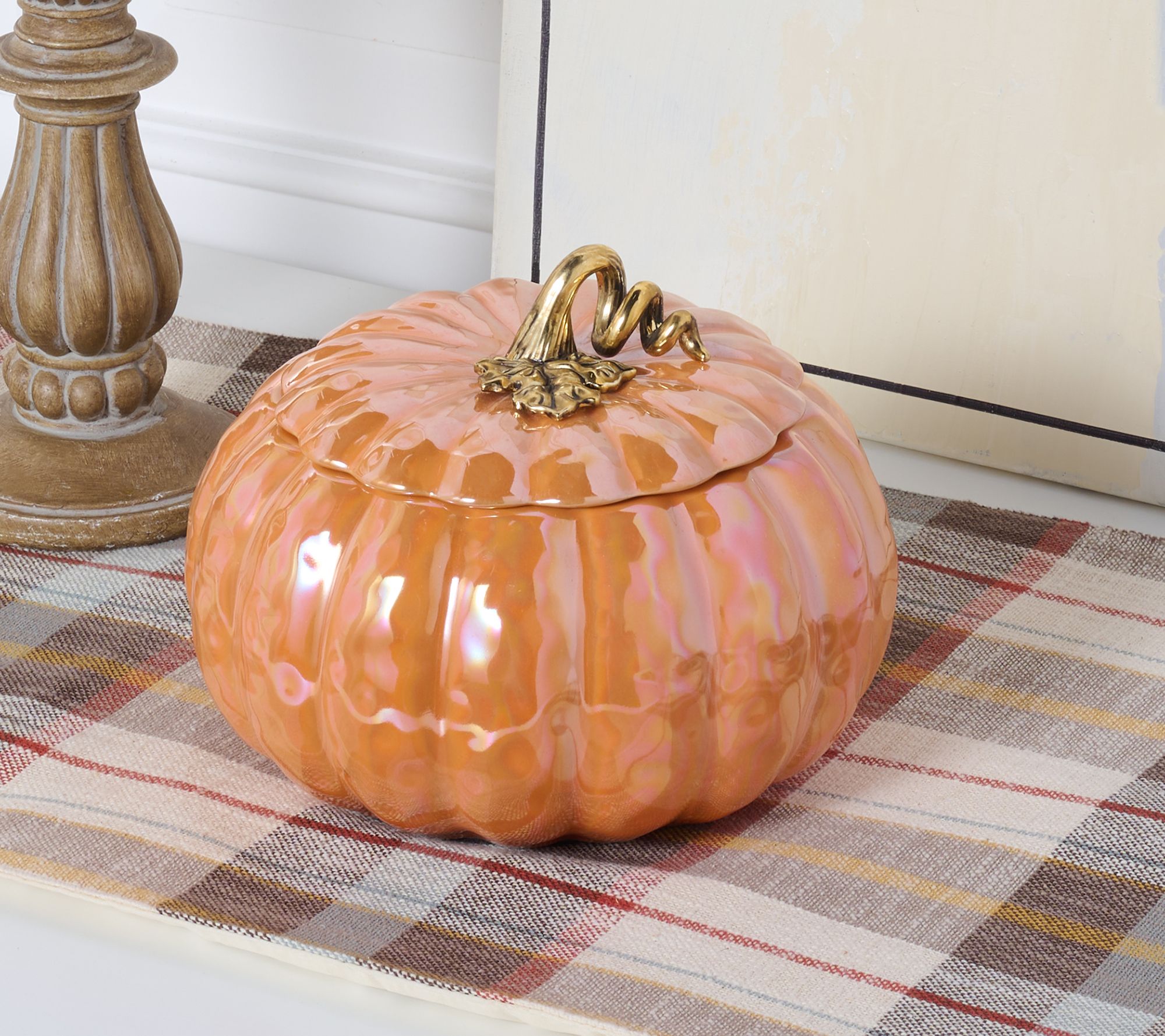 • Ceramic pumpkin vessel with colored iridescent glaze and metallic goldtone stem on lid; black pad on base