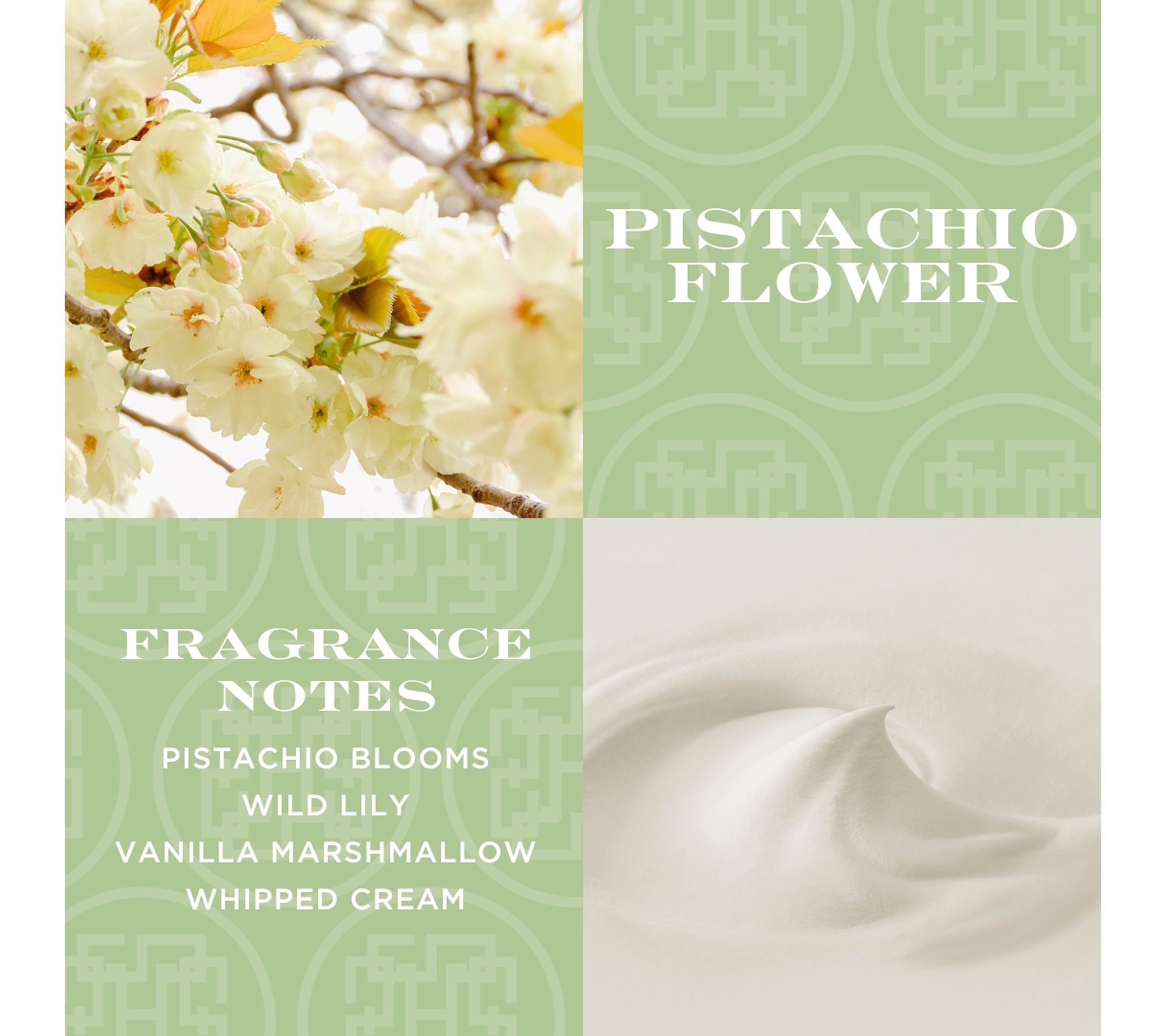 Pistachio Flower: blooms combined with airy wild lily, wrapped in a swirl of vanilla marshmallow and whipped cream for a delicate, creamy floral fragrance