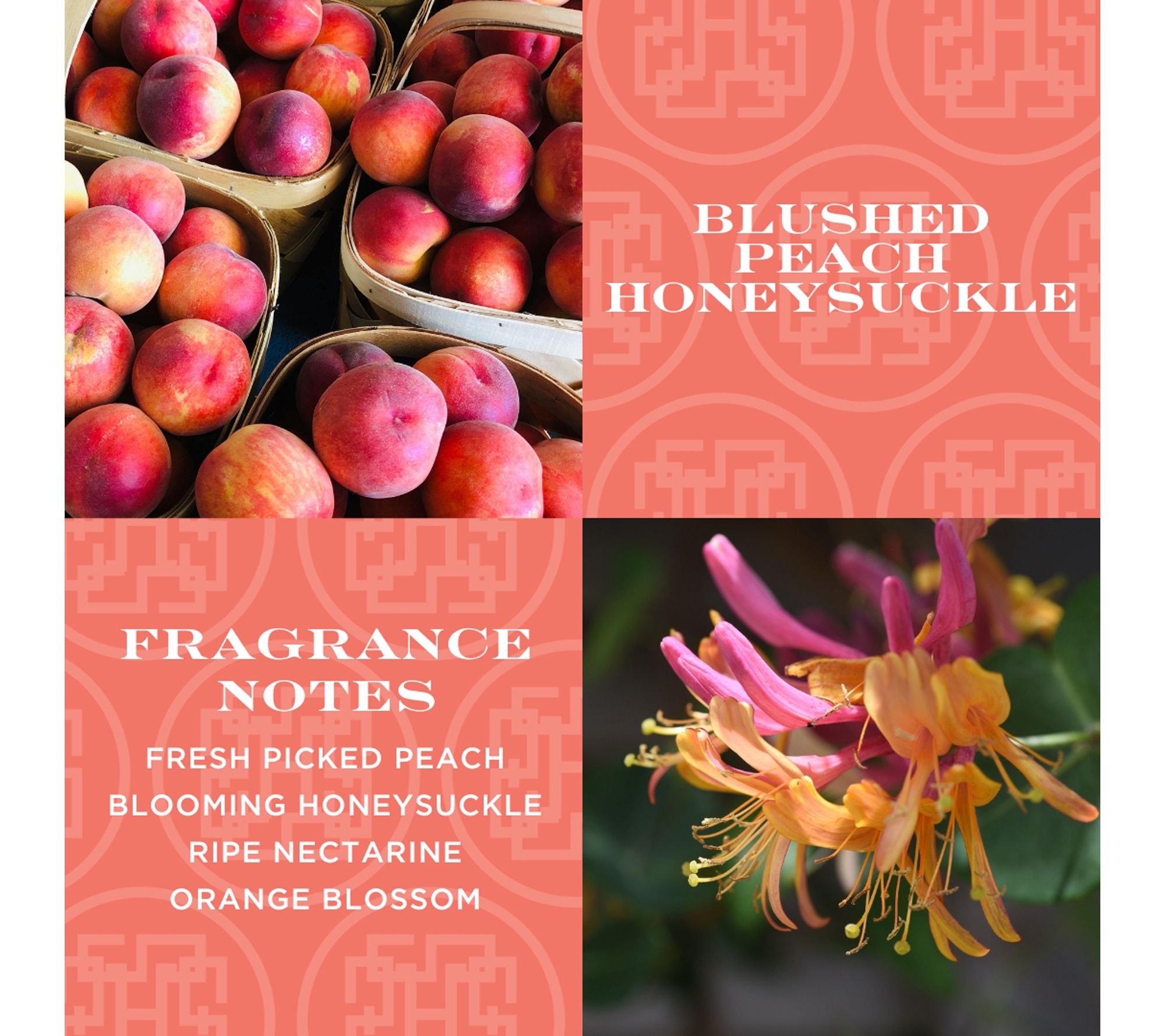 Blushed Peach Honeysuckle: closes the garden gate with a tender embrace of sun-warmed peaches and climbing honeysuckle vines, combined with ripe nectarine, creating a sweet and nostalgic springtime scent
