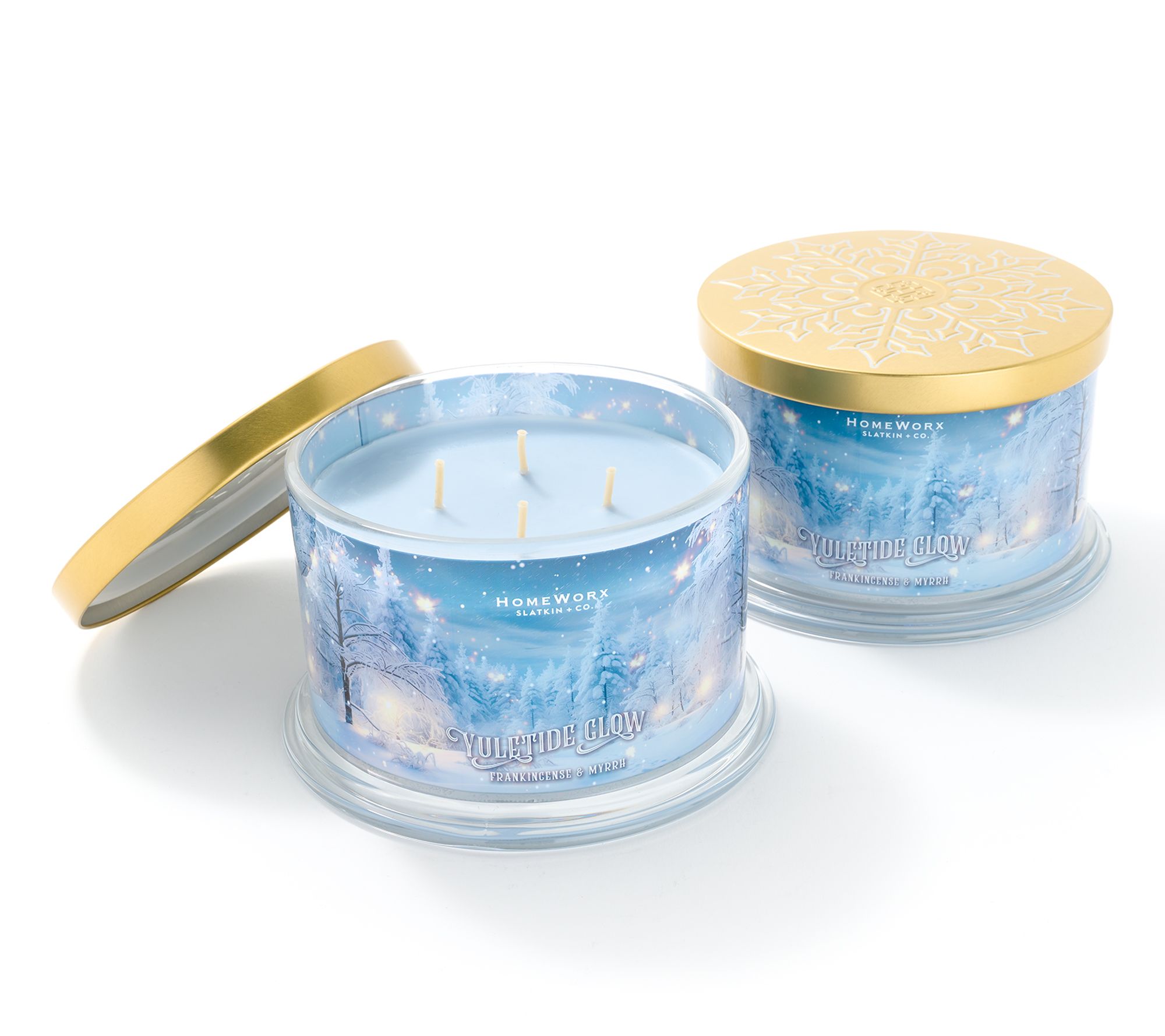 • Includes two 18-oz Yuletide Glow (Frankincense and Myrrh) scented candles