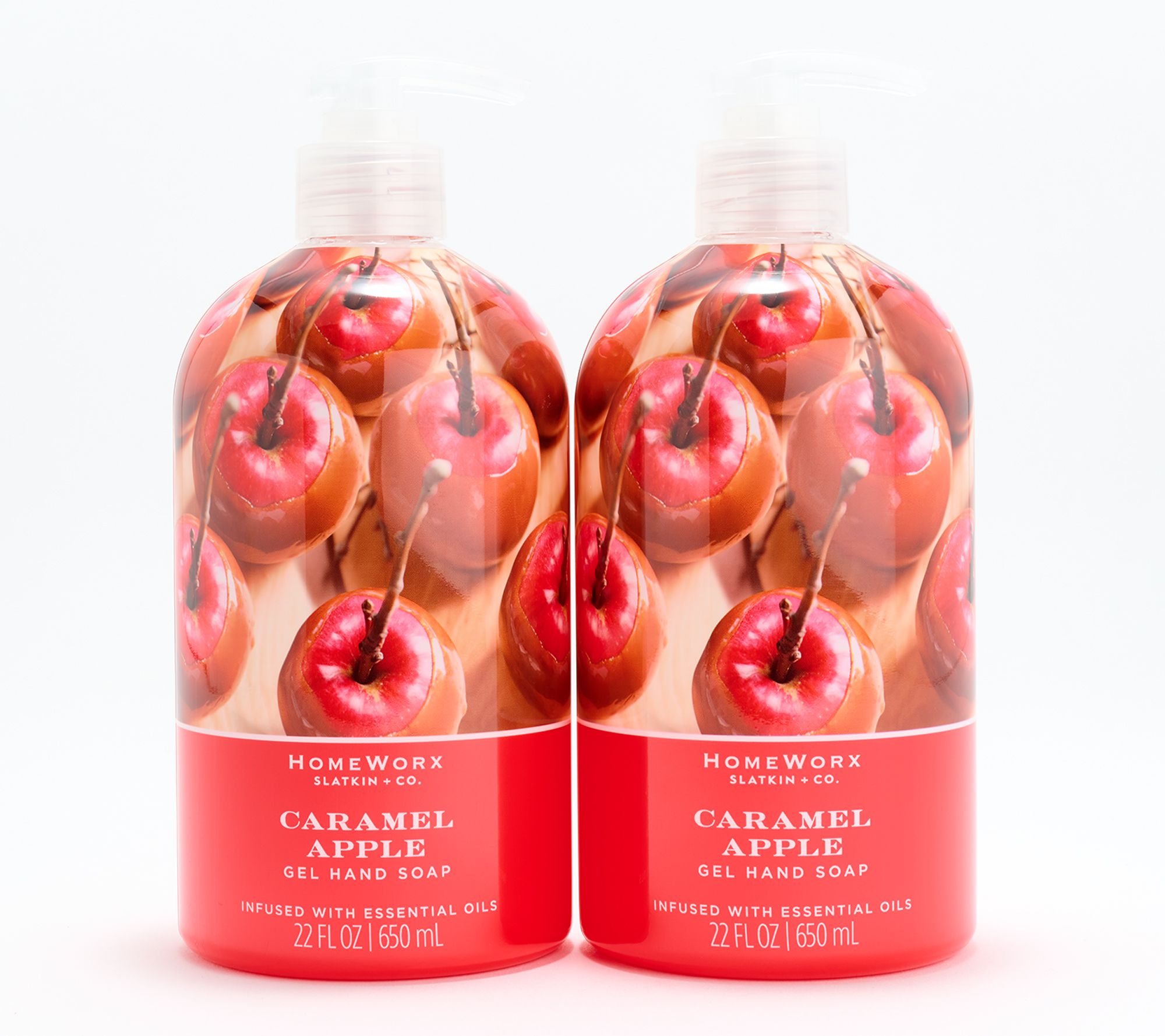 Raise a hand if you love Harry Slatkin's candles! Now you can have two hands in with this (giftable) set of seasonal-scented Caramel Apple hand soaps. Lather up and gently cleanse your cares away with gel soap that leaves hands lightly scented and refreshed (while adding a festive accent to your bath or kitchen, too). From HomeWorx by Slatkin + Co.