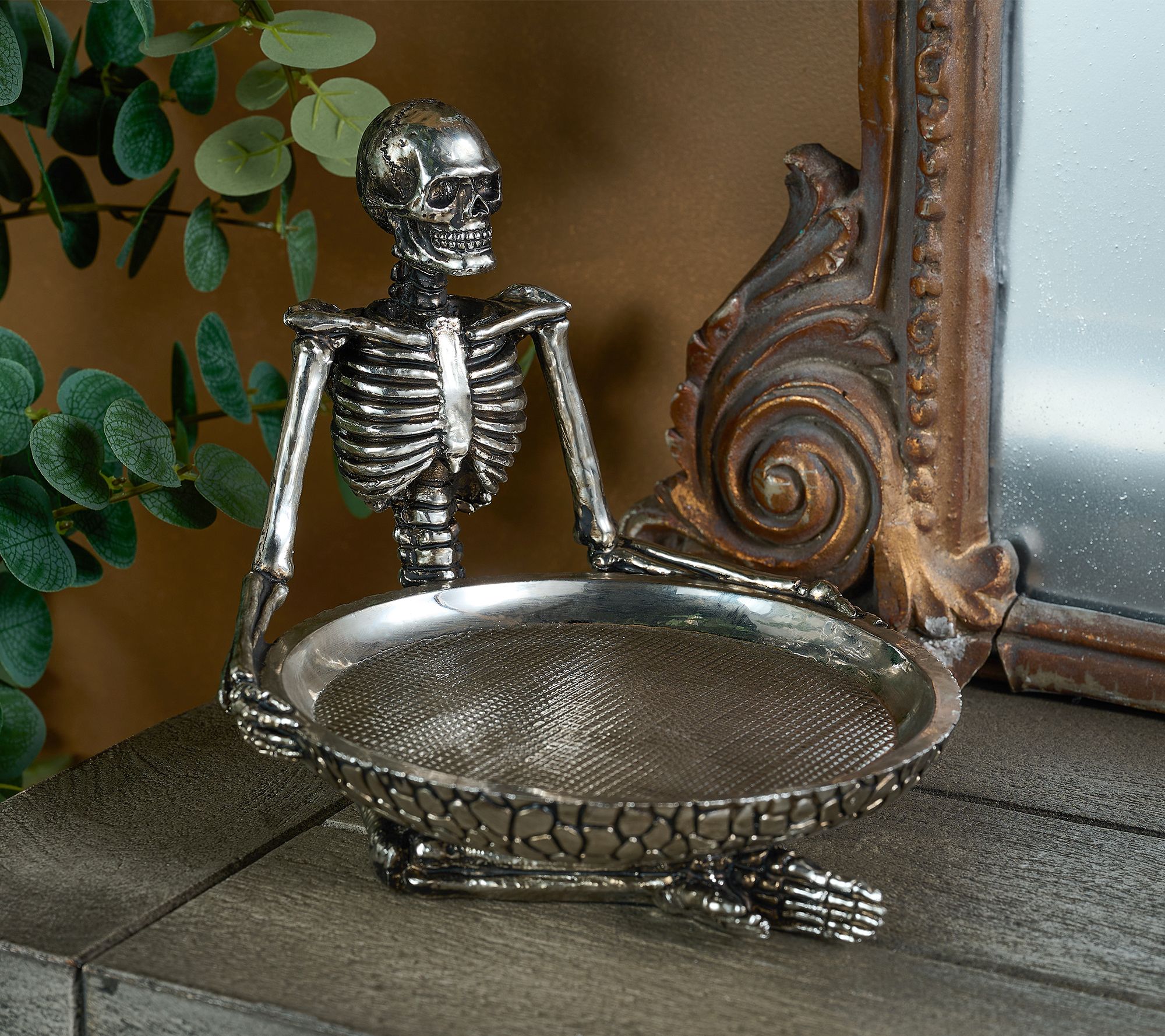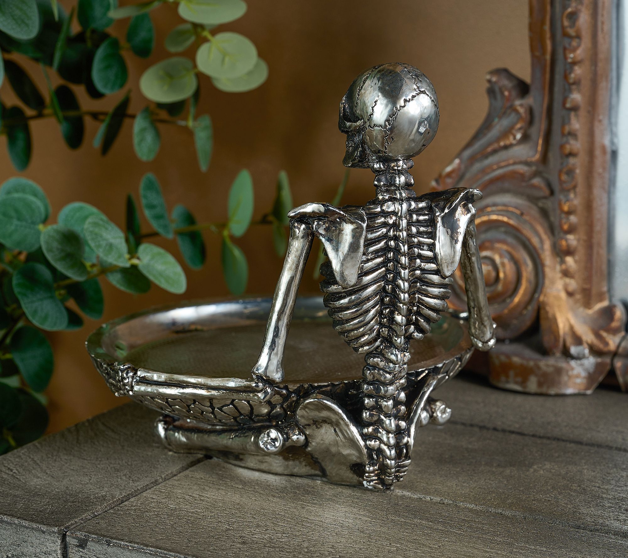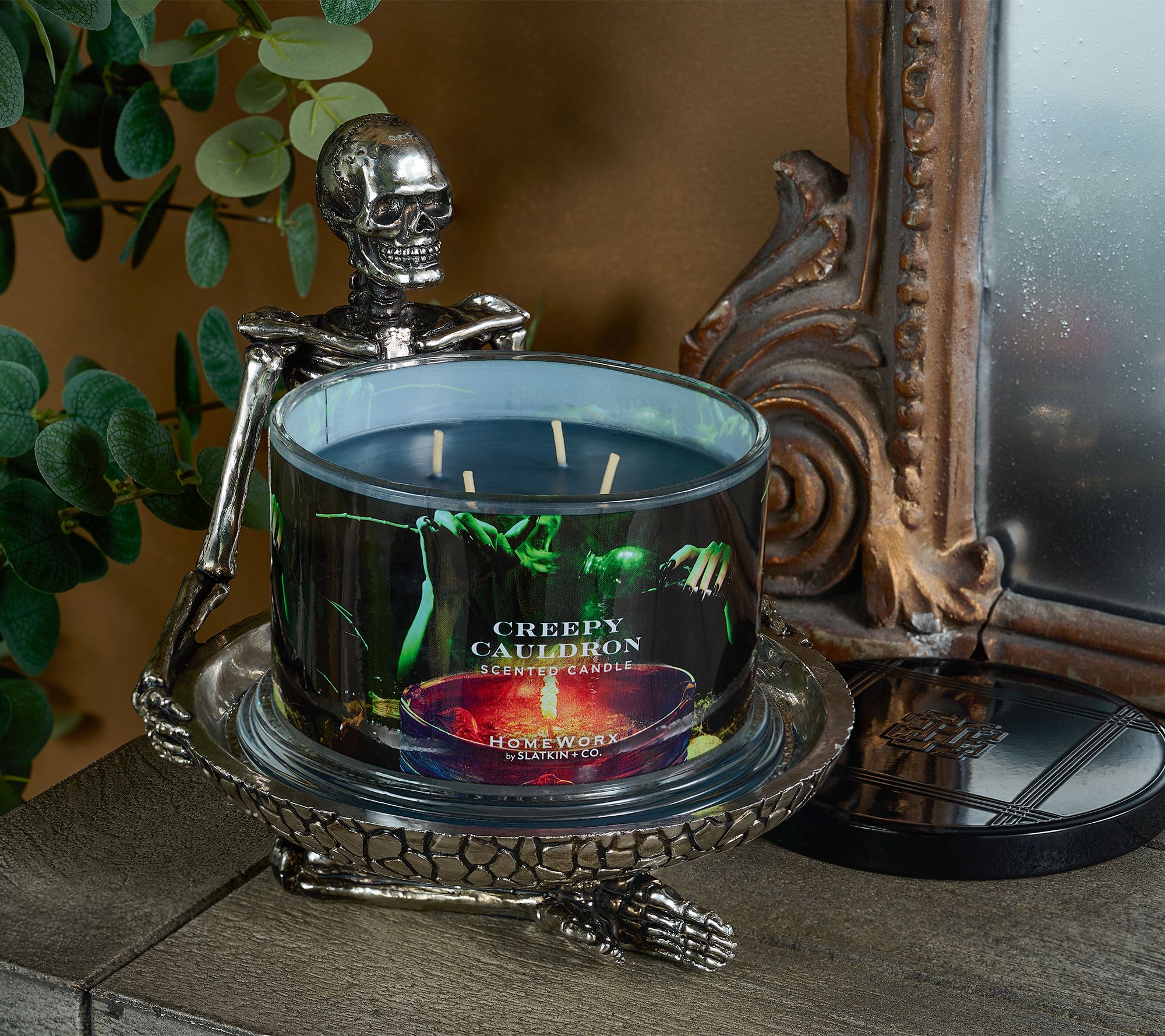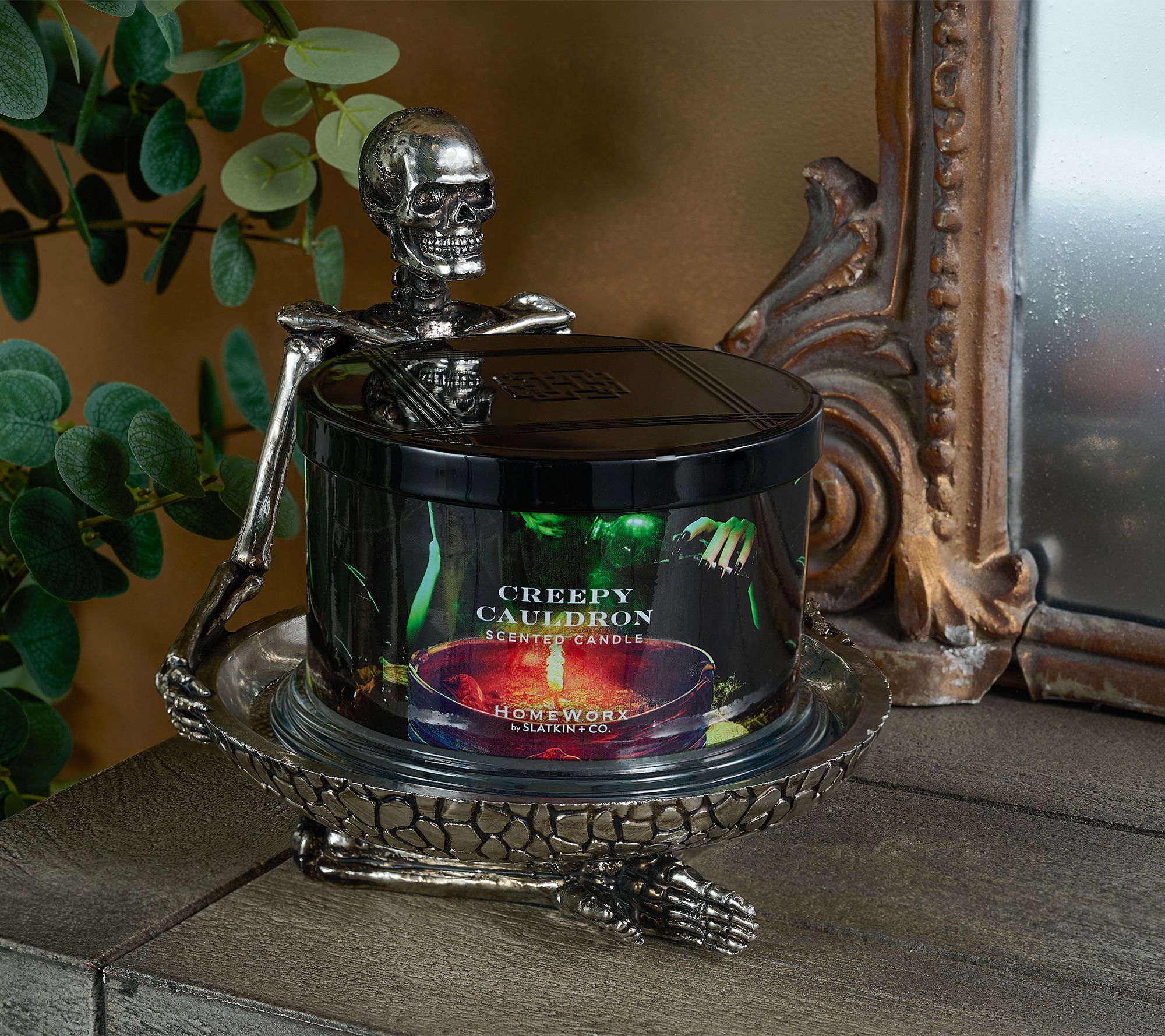 Add a haunting touch to your home with this skeleton pedestal and Creepy Cauldron candle. The intricately detailed resin pedestal is done in an antiqued silvertone finish and holds the festive candle (with a scent you'll adore!). From HomeWorx by Slatkin + Co.
