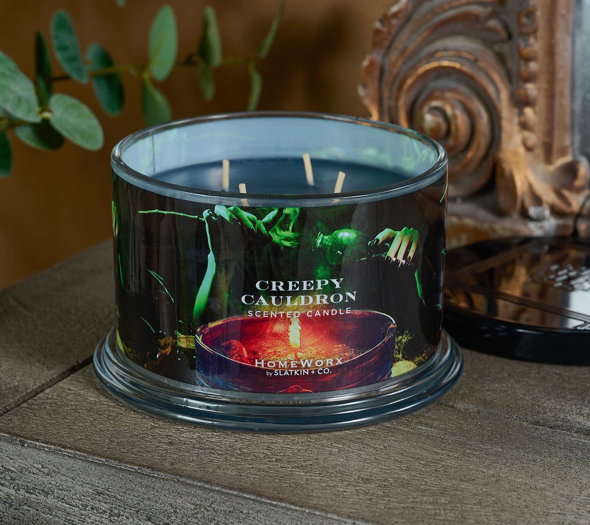 Includes skeleton pedestal candle holder and 18-oz Creepy Cauldron candle