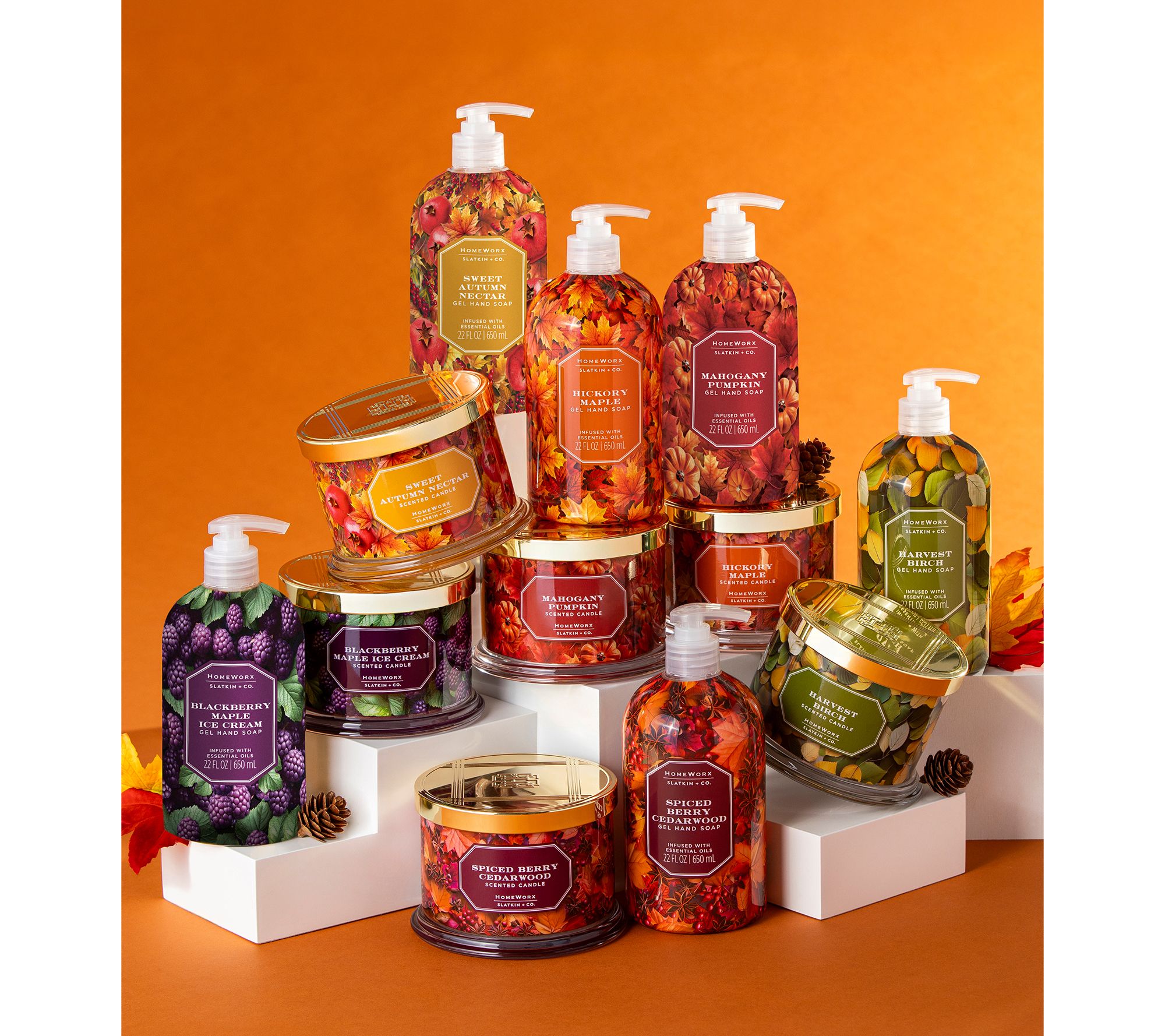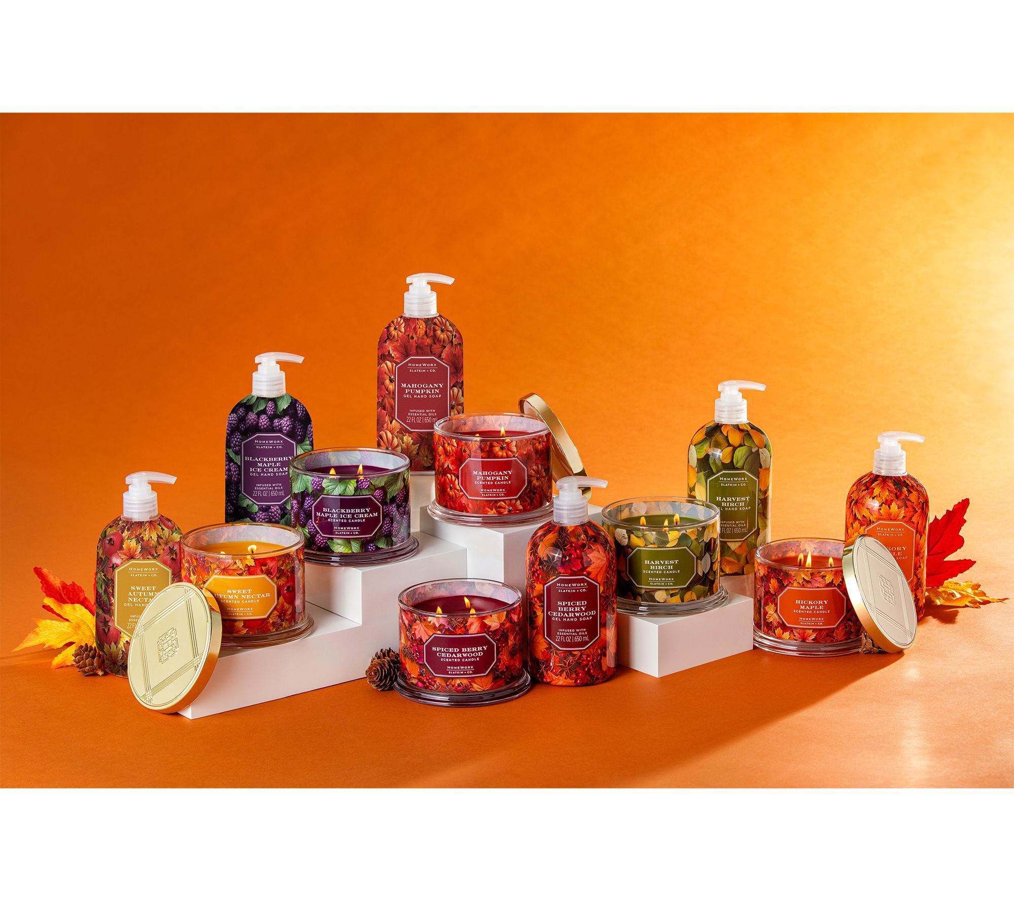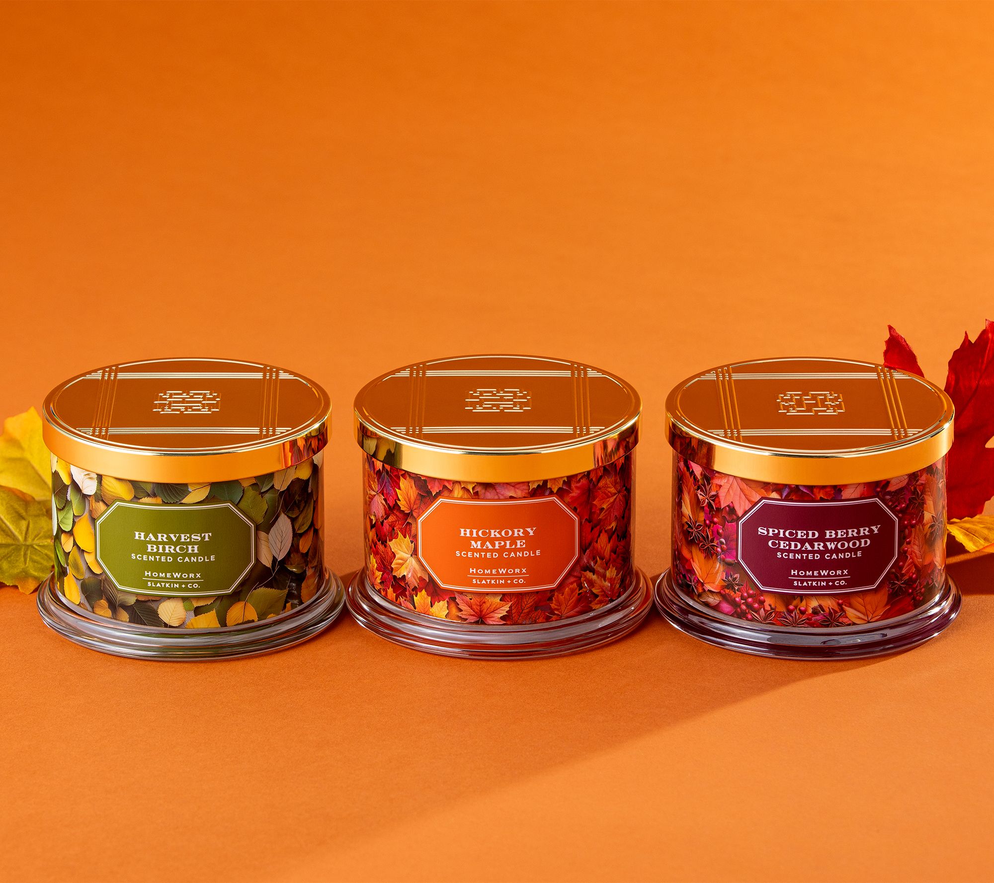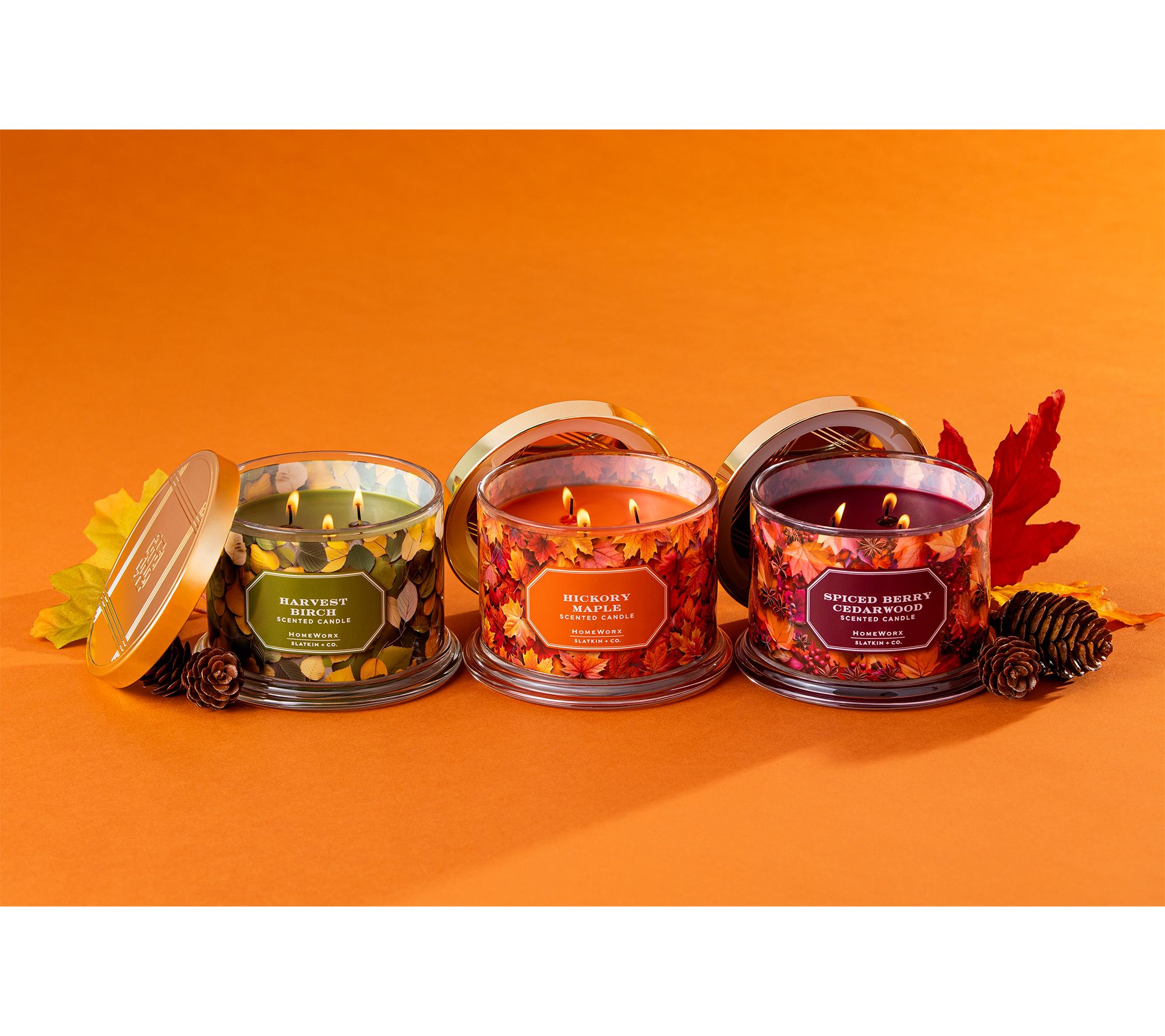 Cozy evenings come alive with the inviting fragrance and gentle glow of this autumn candle set by HomeWorx. Each three-wick candle evokes a walk through the woods with fall aromas that delight the senses and welcome guests into your home. Place them on your mantel, in your kitchen, or anywhere that could use a touch of harvest beauty. From HomeWorx by Slatkin + Co.