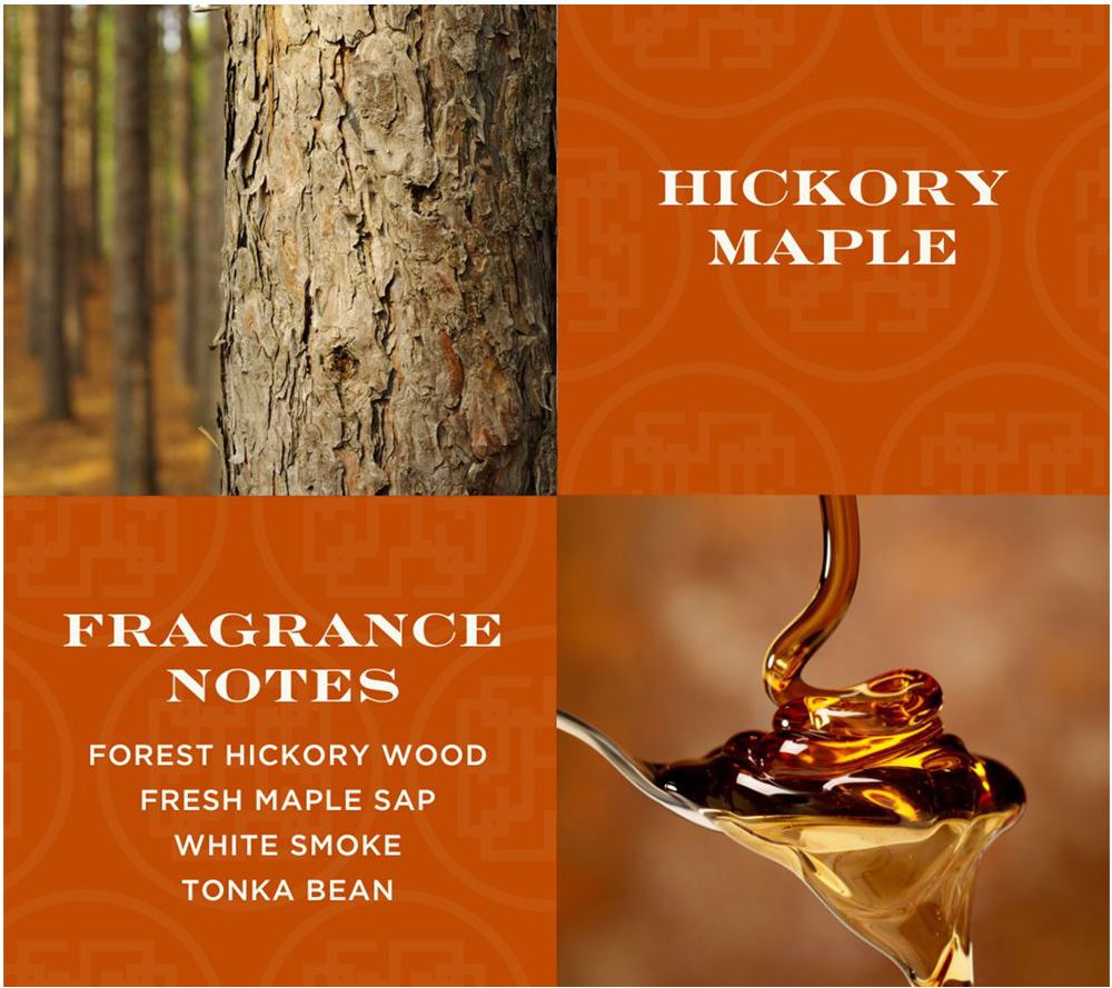 Includes 14-oz Hickory Maple scented candle, 14-oz Harvest Birch scented candle, and 14-oz Spiced Berry Cedarwood scented candle
