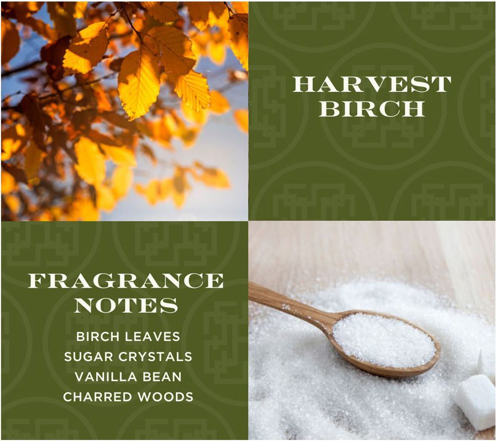 Harvest Birch: notes of birch leaves, sugar crystals, vanilla bean, and charred wood