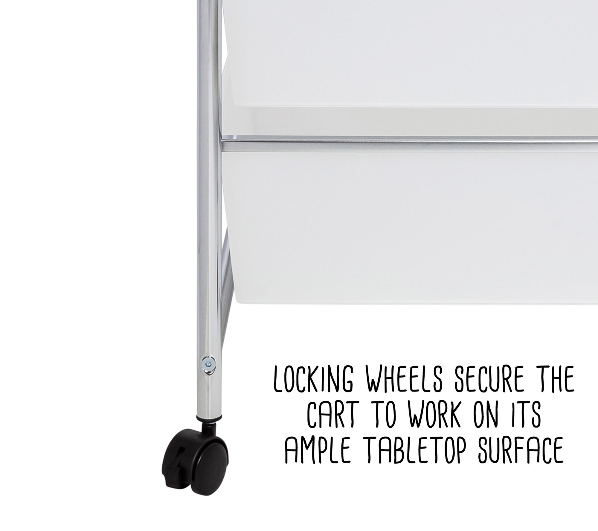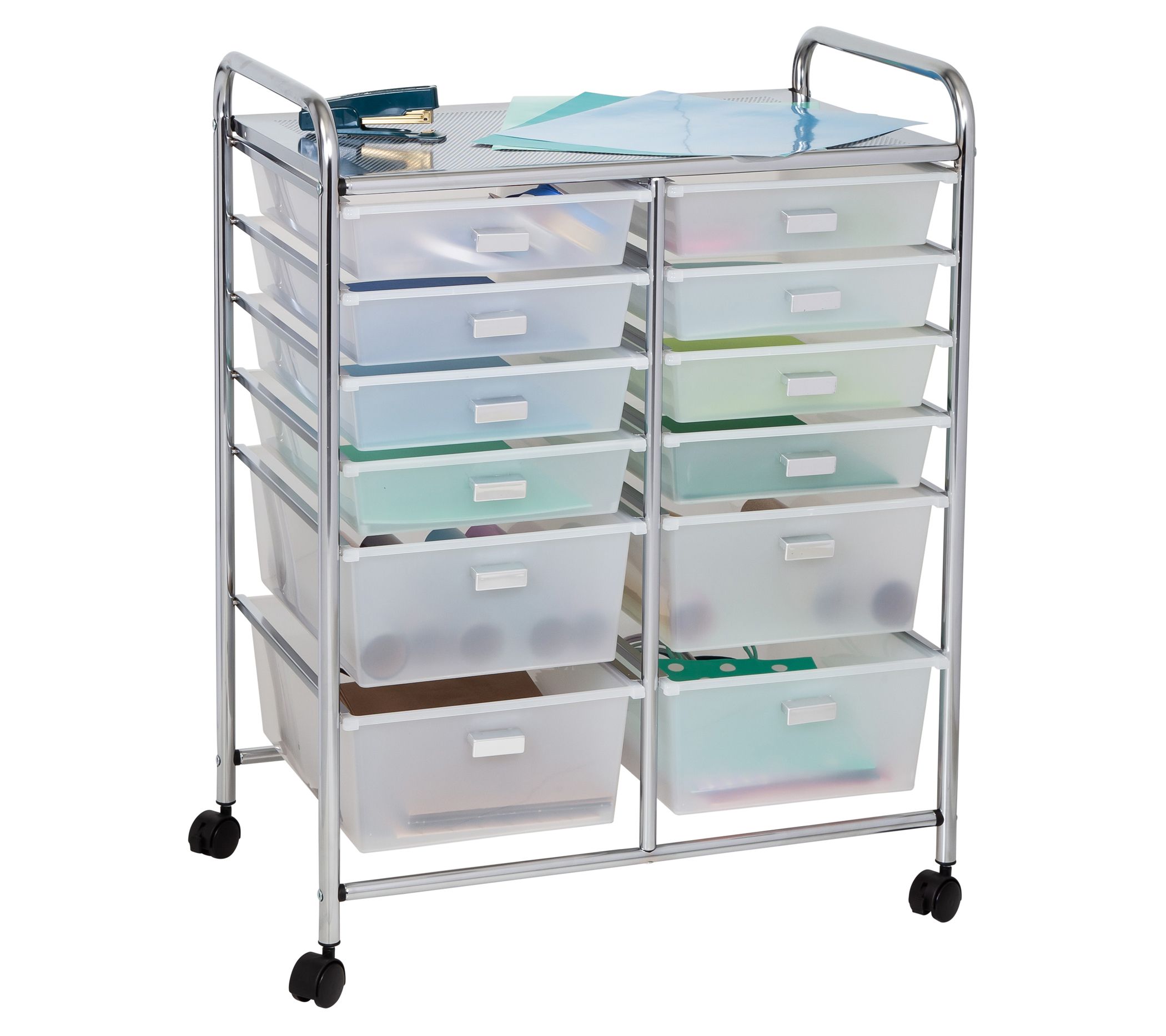 Its locking wheels and ample tabletop surface make it the perfect pop-up work station. The two columns of drawers divvy up supplies equitably, so that multiplication tables don't get mixed up with monthly business reports.