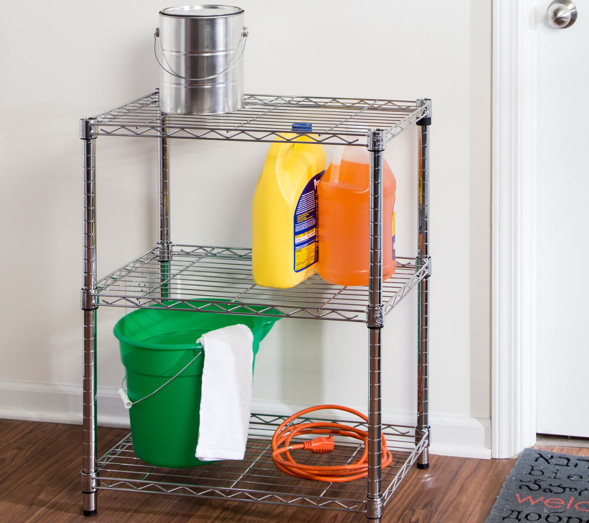 A stellar storage solution. Restore order to a messy garage, mudroom, or kitchen with this three-tier commercial-grade shelving unit, done in a modern chrome finish. The sturdy unit features adjustable shelves and stackable components for easy modification. From Honey-Can-Do.