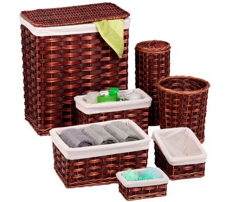 Get your bath looking organized and coordinated with this handsome, seven-piece wicker kit. Keep your phone elevated and dry in the media holder, and store magazines, toilet tissue, and other essentials in the other included pieces. The rectangular hamper has a compact footprint, yet provides ample space for laundry. From Honey-Can-Do.