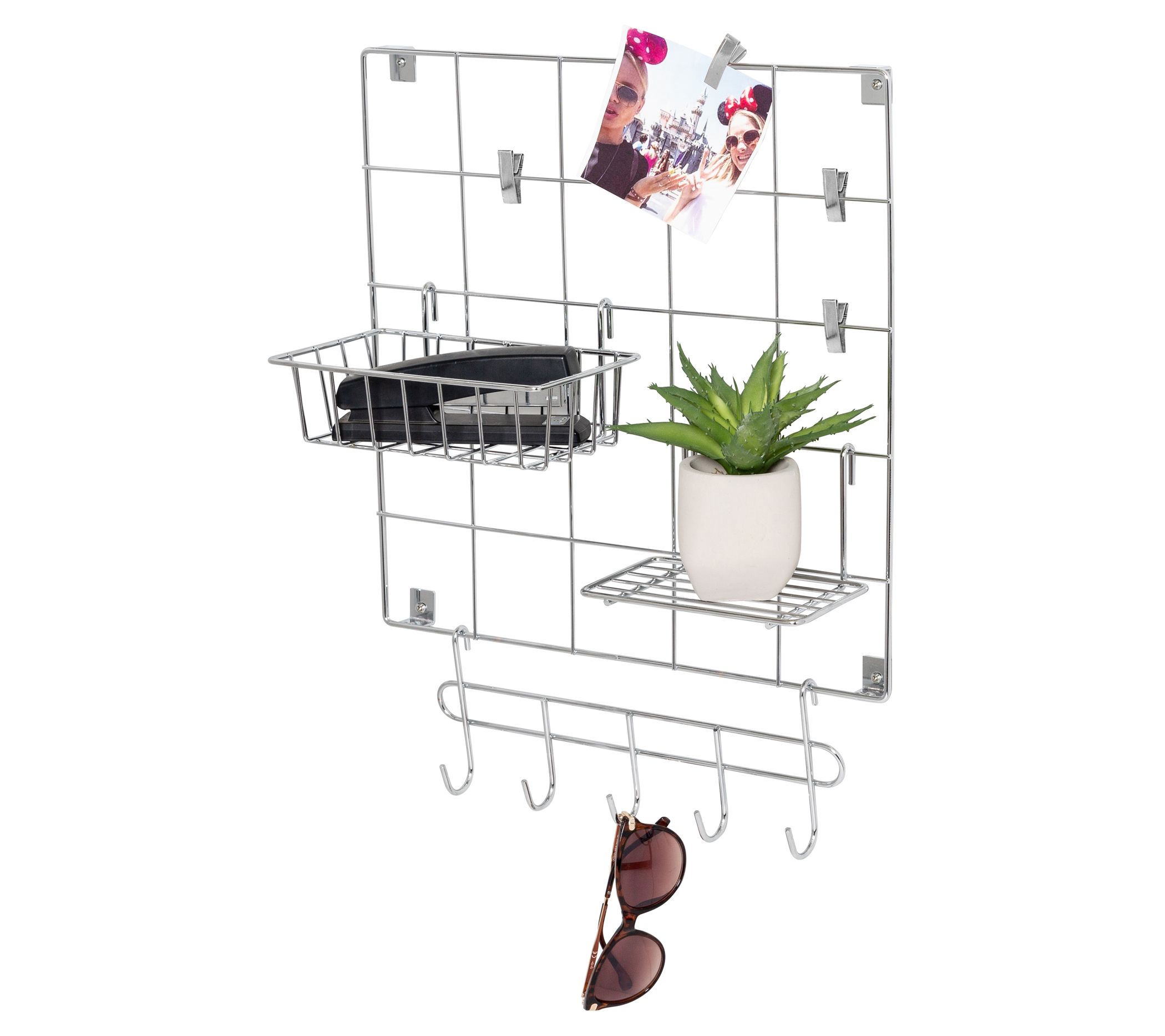 Banish surface clutter with the help of this handy wall grid kit. Just hang it on your wall and use the included shelf, basket, clips, and hooks to store your items neatly and out of the way. From Honey-Can-Do.