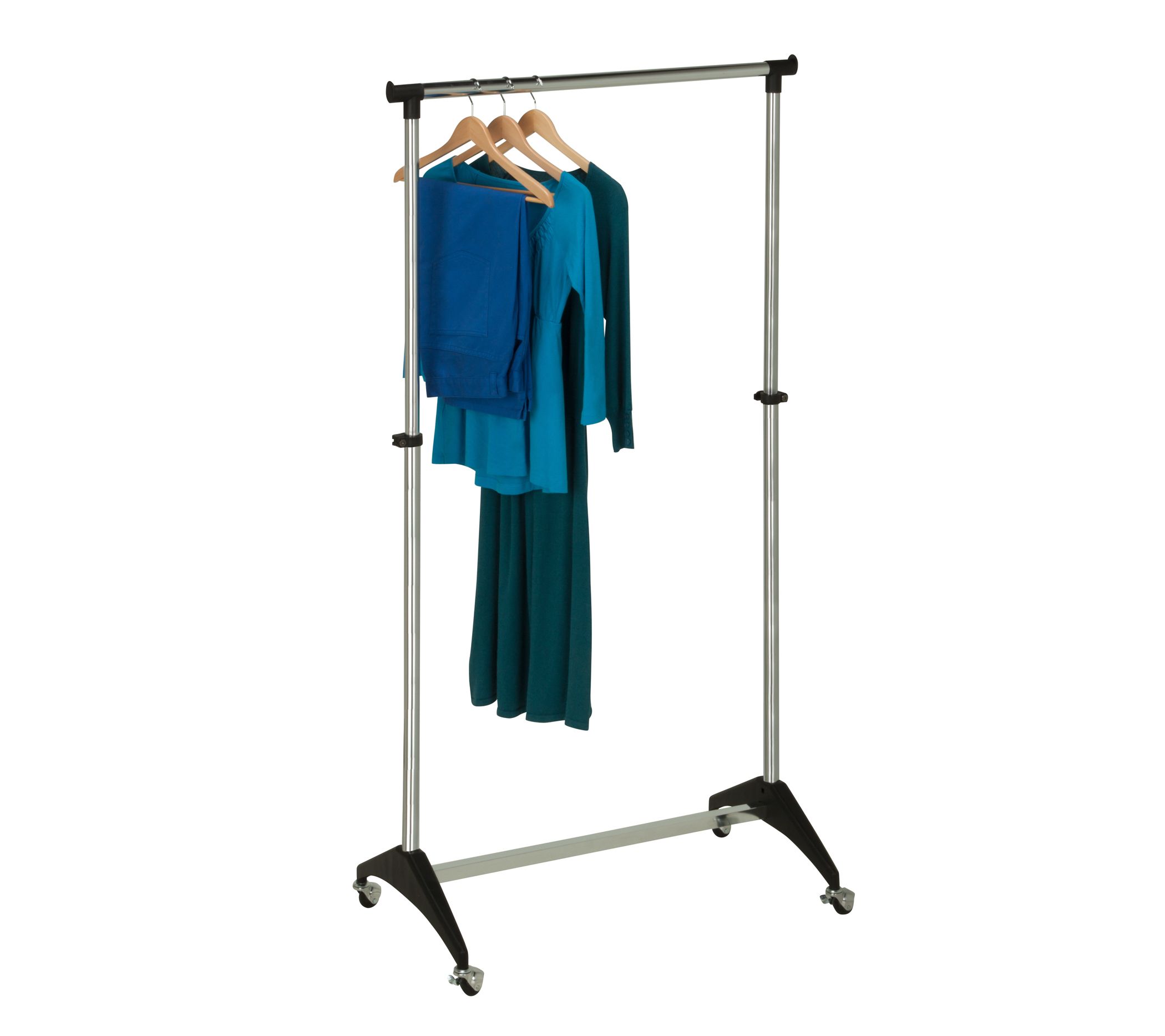This sturdy garment rack features steel construction and goes from room to room on smooth rolling ball casters. The hanging bar adjusts to accommodate short or long garments and is perfect for managing out-of-season clothing, outdoor gear, or items hung to dry in the laundry room. From Honey-Can-Do.
