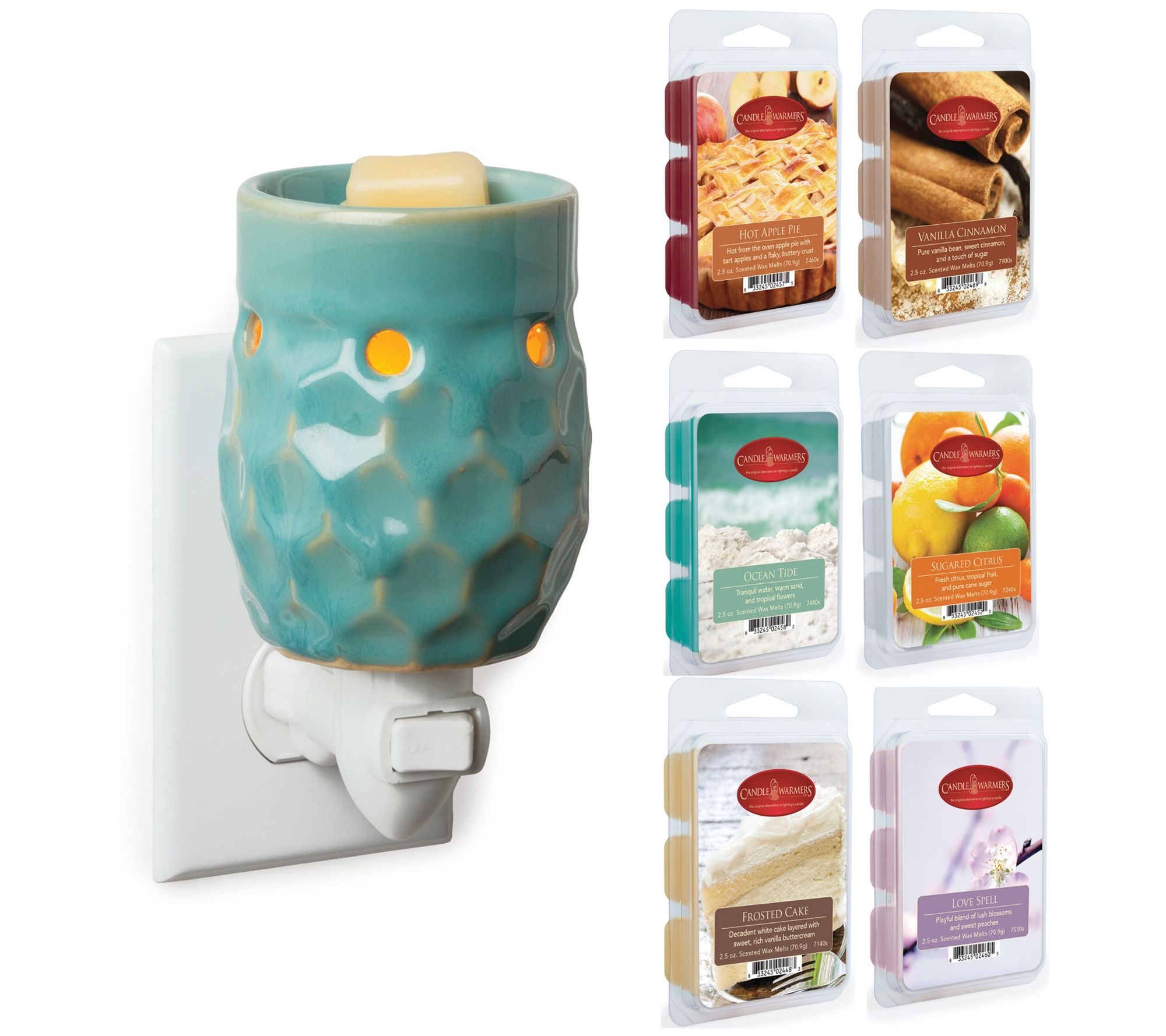 • Includes warmer, 15 watt incandescent warming bulb, and 6 wax melts in scents of in scents of Sugared Citrus, Vanilla Cinnamon, Love Spell, Ocean Tide, Hot Apple Pie and Frosted Cake