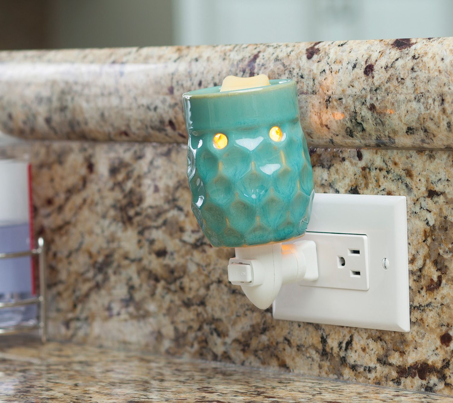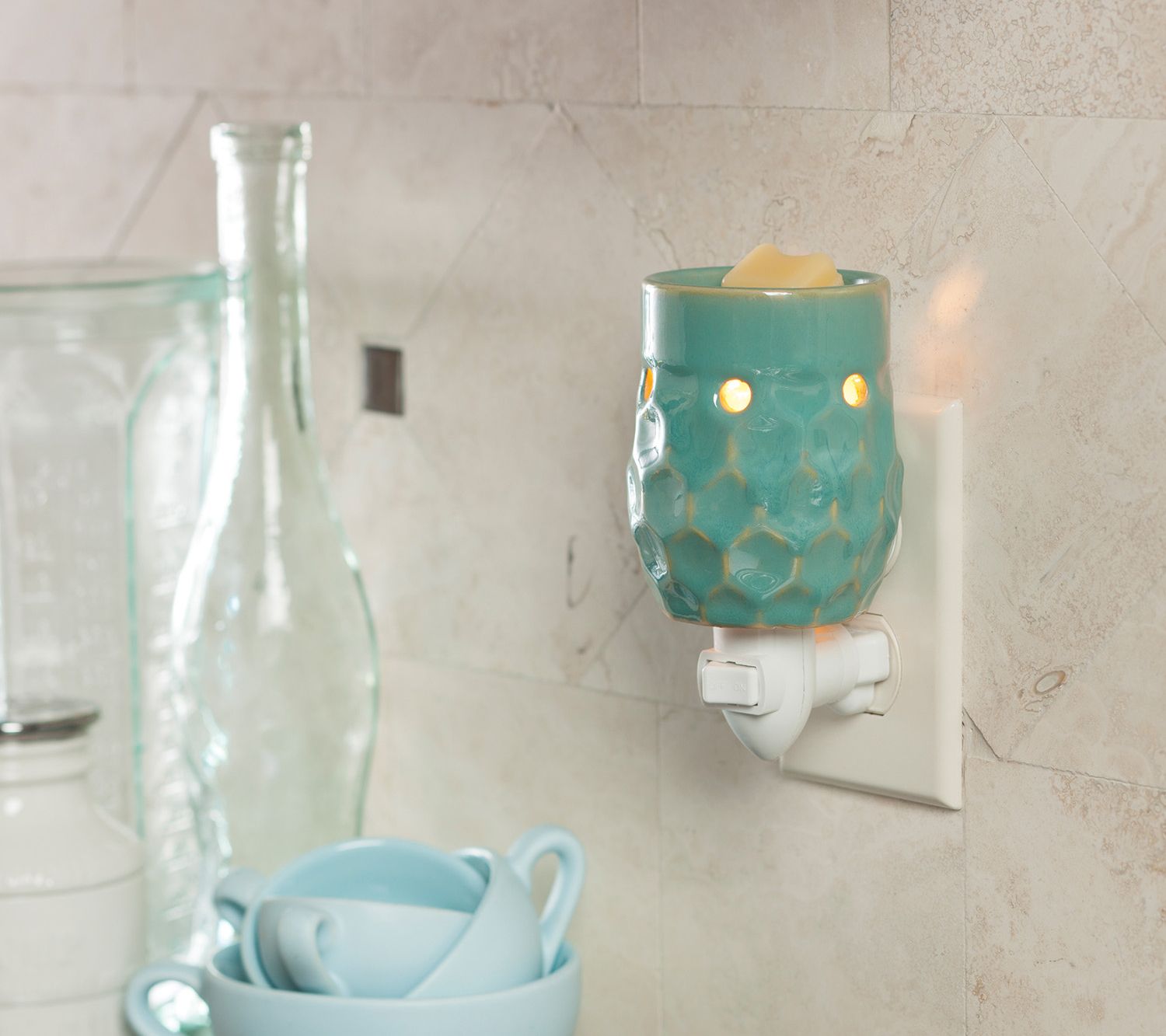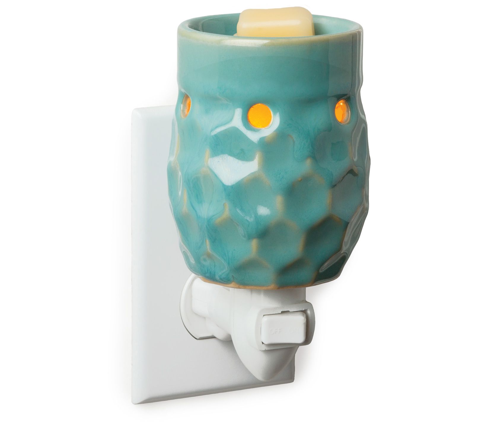 Bring a bright addition to your decor with this turquoise reactive-glaze pluggable warmer featuring an allover honeycomb pattern. This plug-in warmer has a rotating base so it fits both horizontal and vertical outlets, and warms wax melts to safely release a delightful fragrance throughout your home. This warmer includes six packages of scented, paraffin wax melts. From Candle Warmers, Etc.