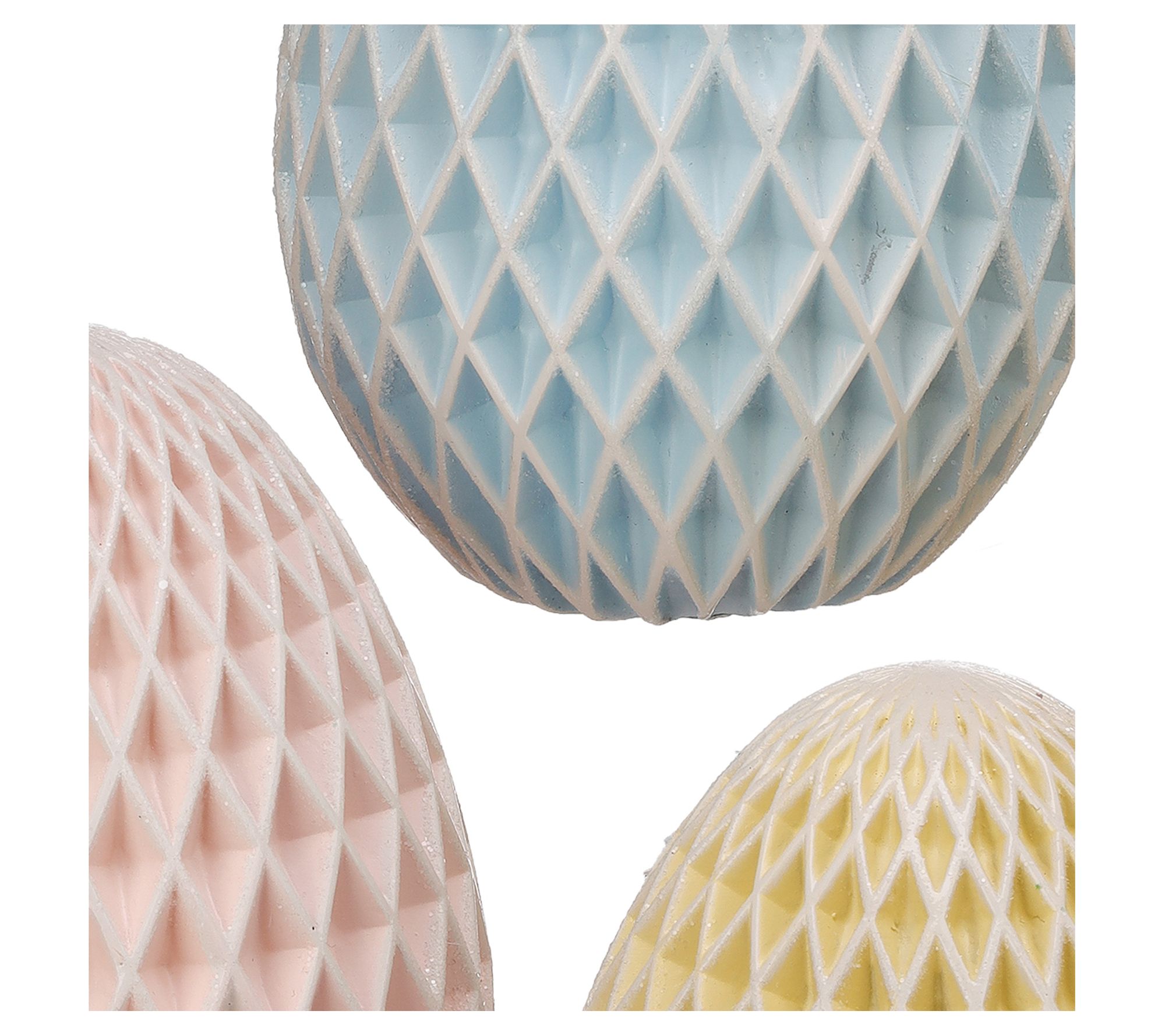 Bring a touch of charm to a springtime or Easter display when you have this trio of eggs, each featuring a honeycomb design in a soft pastel color. From the Valerie Parr Hill Collection.