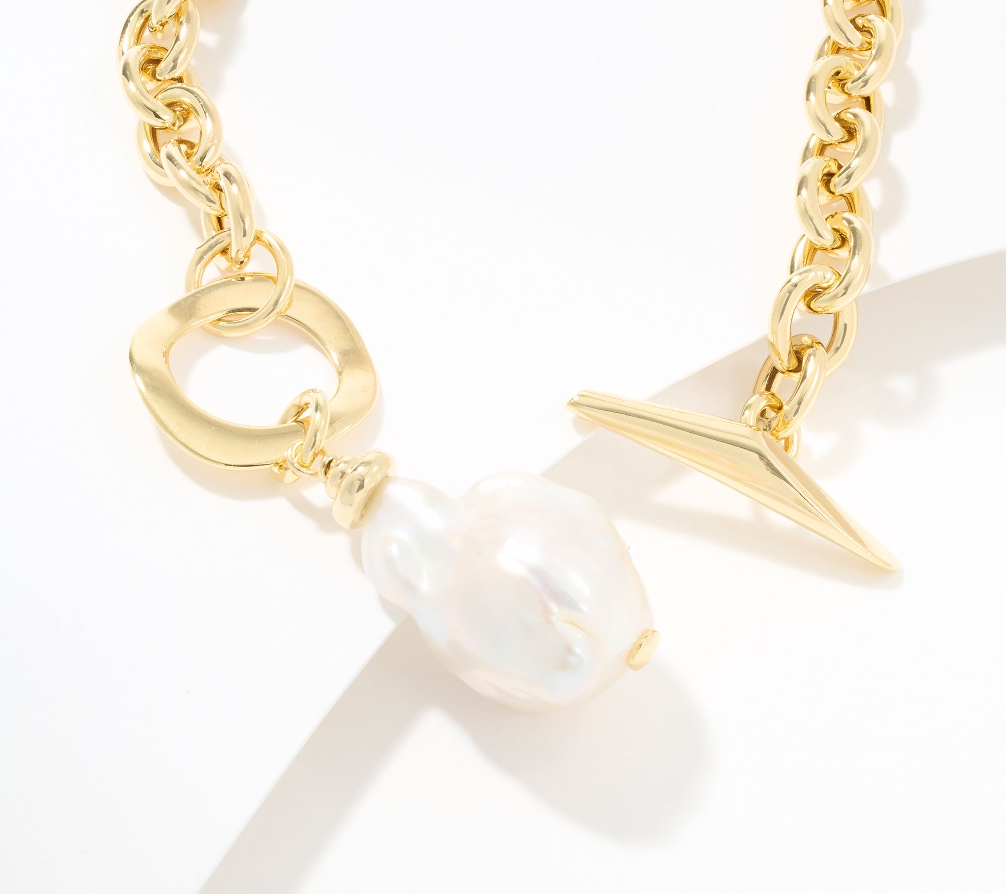 Oval roll chain design with dangling, baroque-shaped white cultured freshwater pearl; polished finish