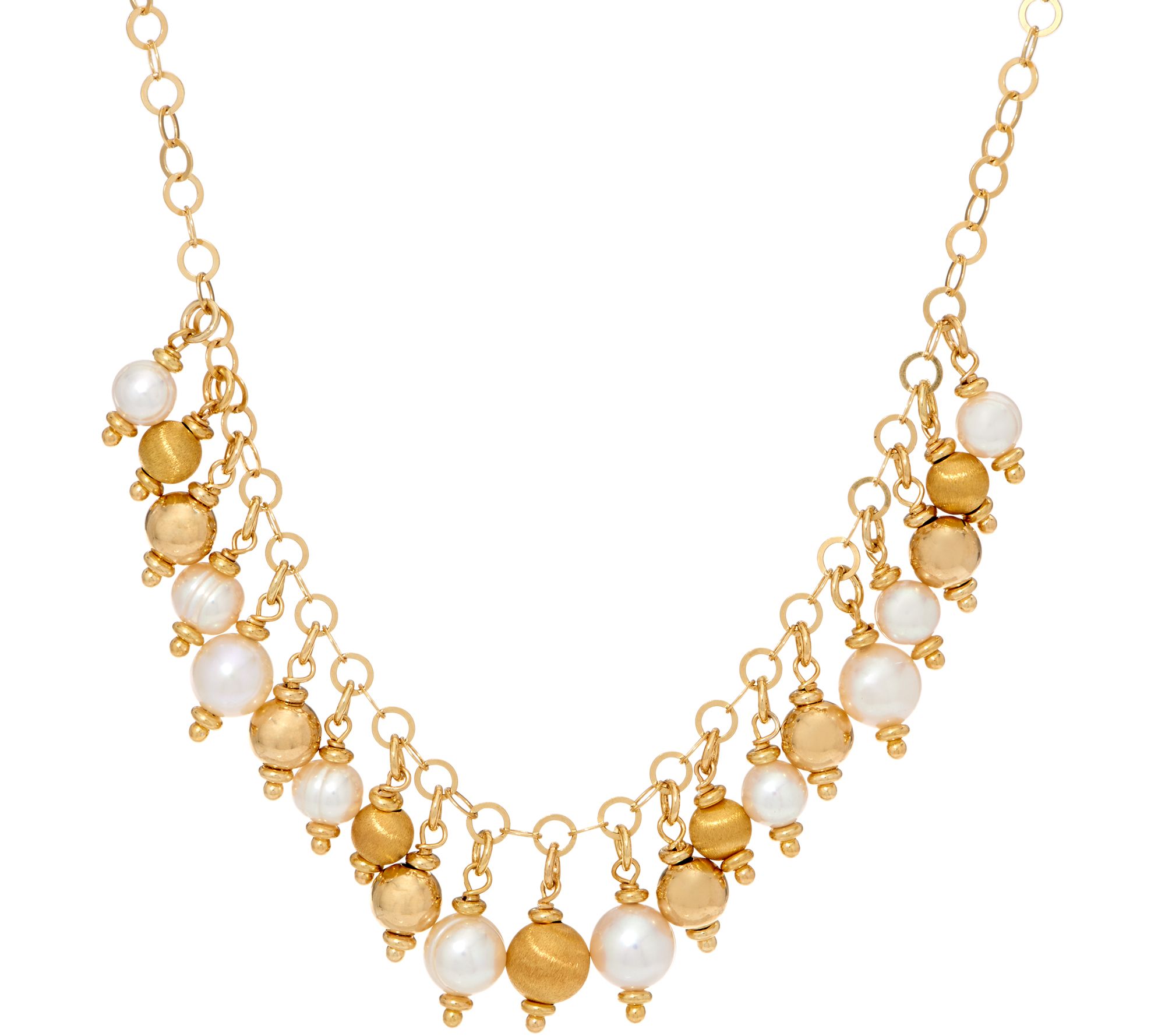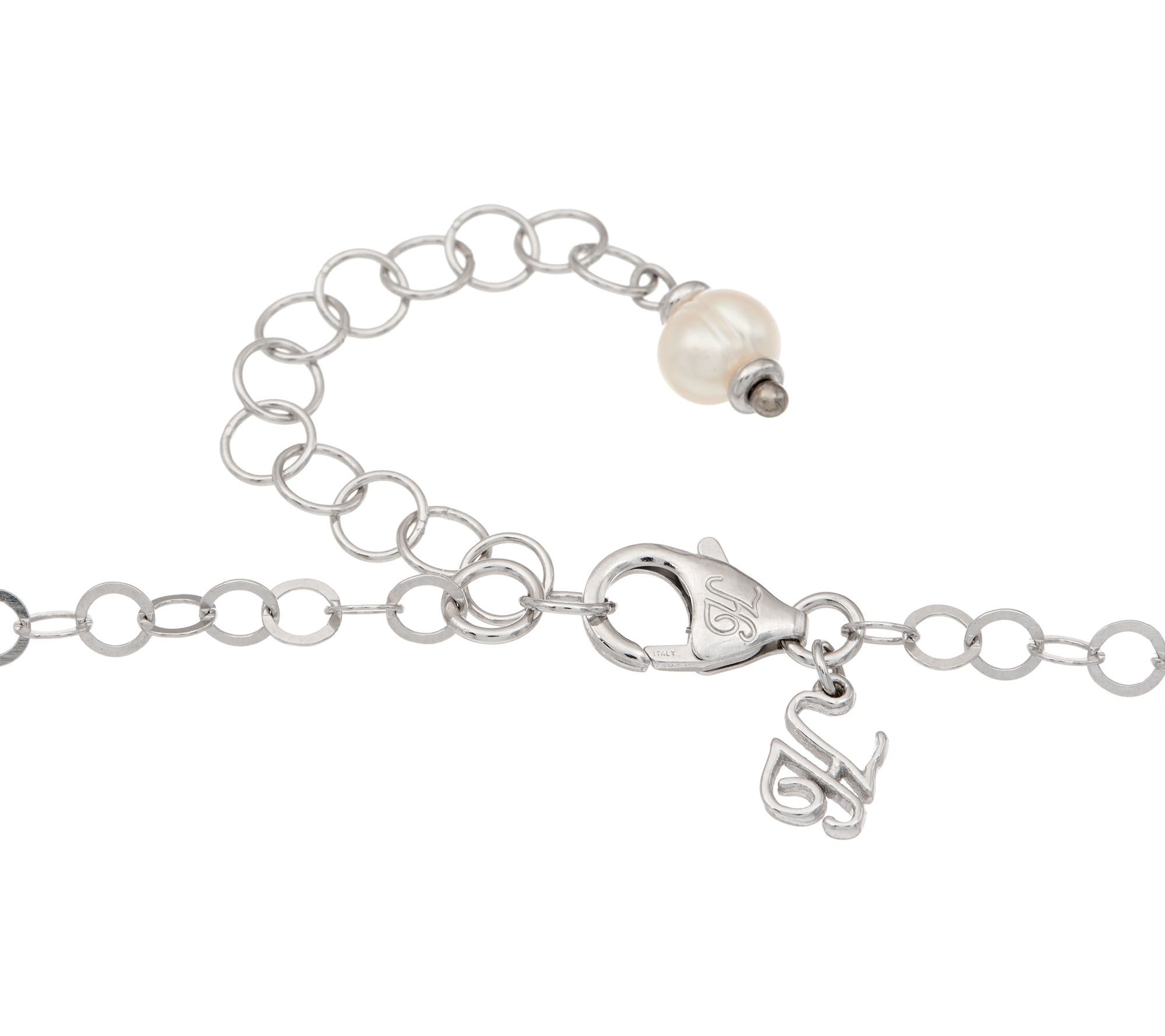 Flat, polished round link chain with polished and satin finished sterling silver beads and cultured ring pearls dangling from the chain; chain extender has cultured pearl dangle