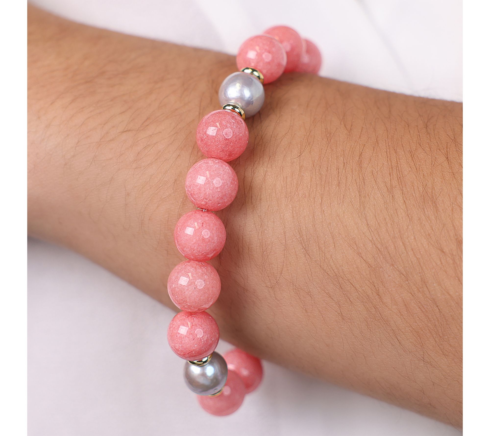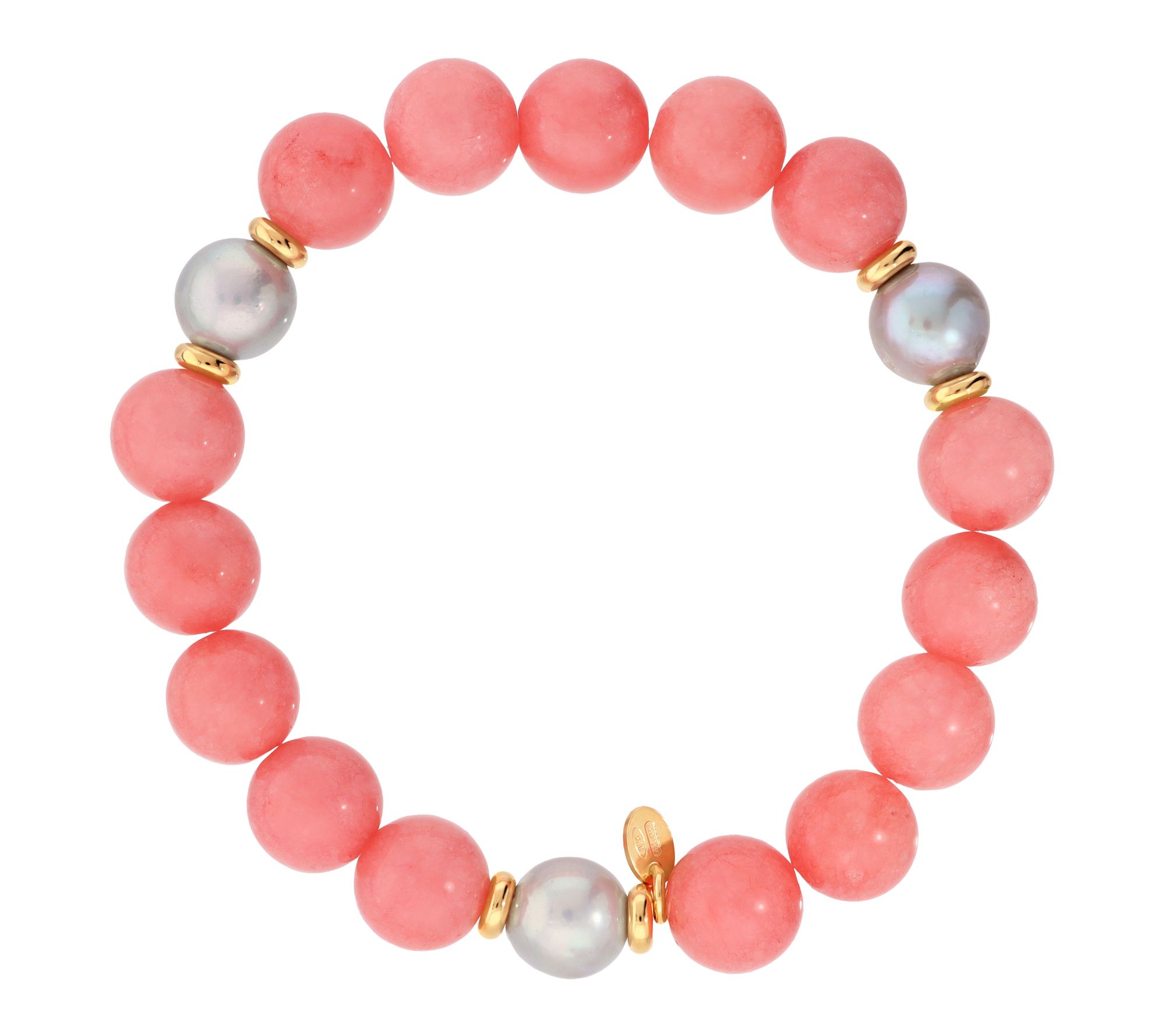 Add a dash of elegance to every outfit with this beaded bracelet that features rhodonite jade beads paired with luminous grey cultured freshwater pearls. Polished 18K yellow gold-plated sterling silver roundels bring subtle shine, while the stretch design slips on with ease for all-day comfort. From Honora.