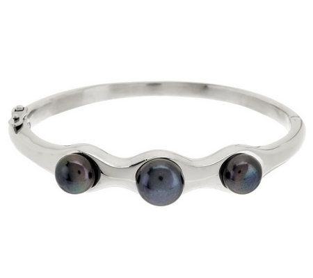 Elegance personified. This stainless steel bangle is stunning with three stations of button-shaped cultured freshwater pearls. Dress it up or down for a look that's all your own. From the Honora Heavy Metal Collection.