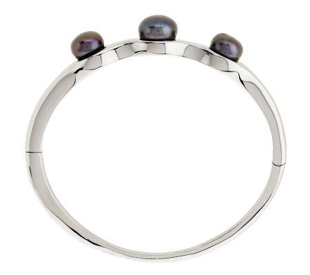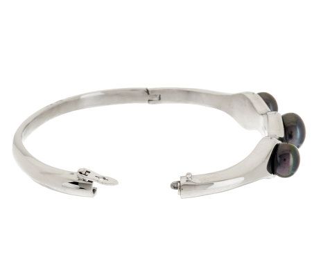 Hinged bangle with three stations of button-shaped cultured freshwater pearls