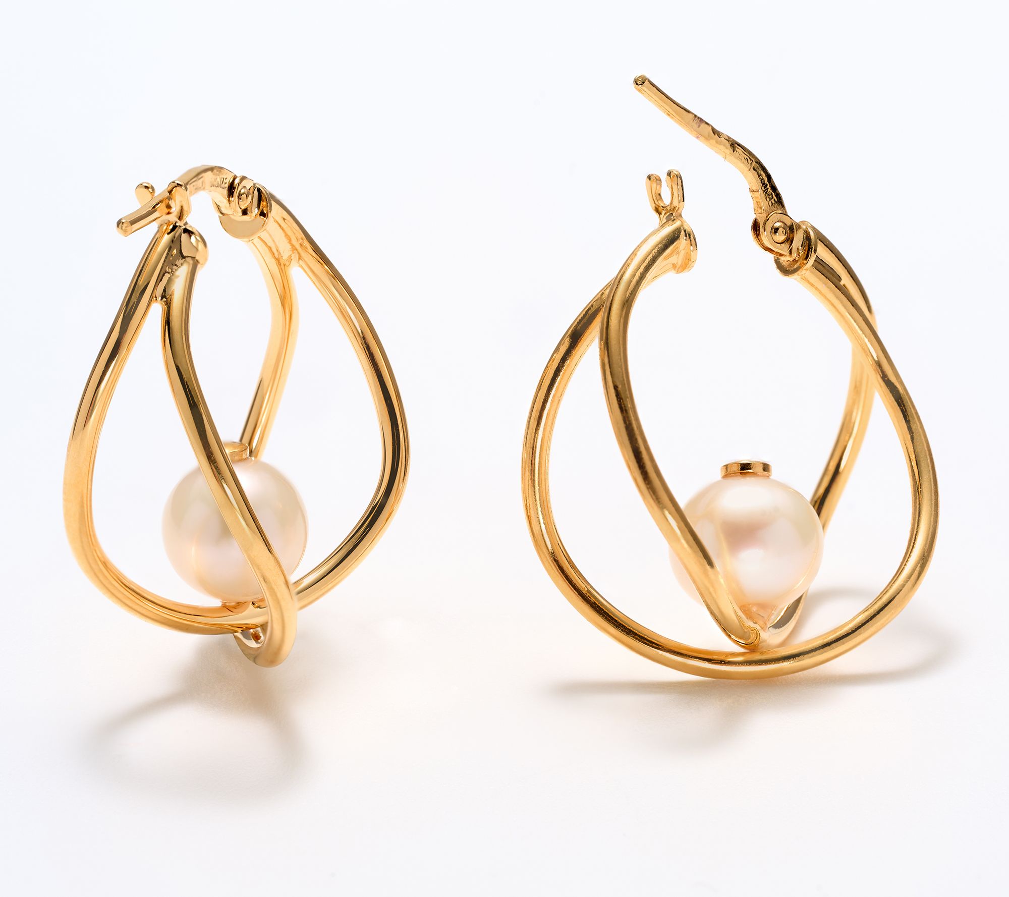 Double round hoops; crossover cage design with potato-shaped cultured freshwater pearl; left and right design; polished finish
