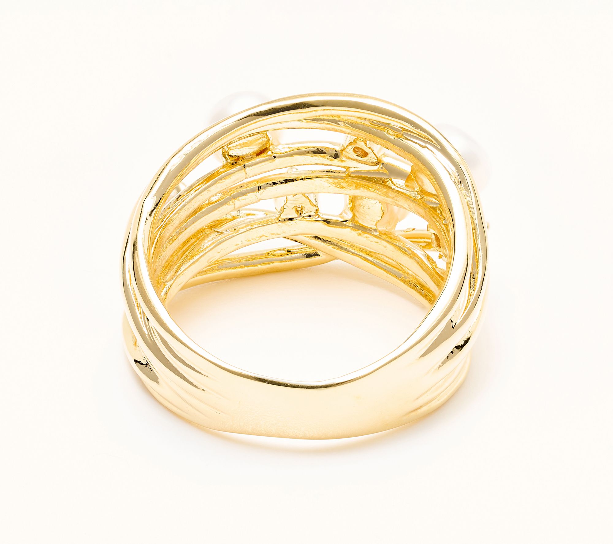 Celebrate your individuality with this crossover detail ring -- they'll catch a glimpse of its luminous cultured freshwater pearls and sparkling simulated diamonds every time you reach for your coffee or raise a glass at dinner. Clean lines, a highway-inspired openwork setting, and gorgeous polish bring classic elegance to everyday moments. From Honora.