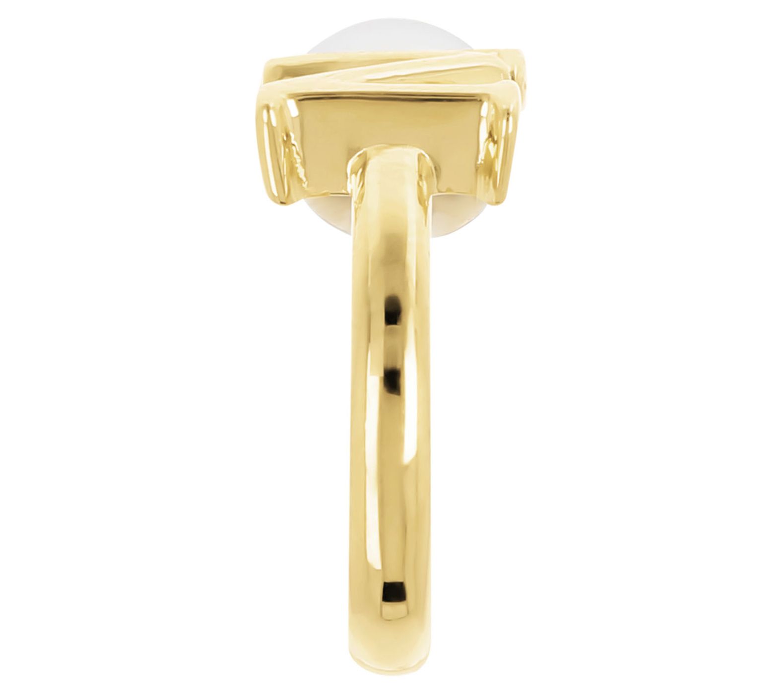 Cuff ring design; initial on one end and round, white cultured freshwater pearl on the other; polished finish