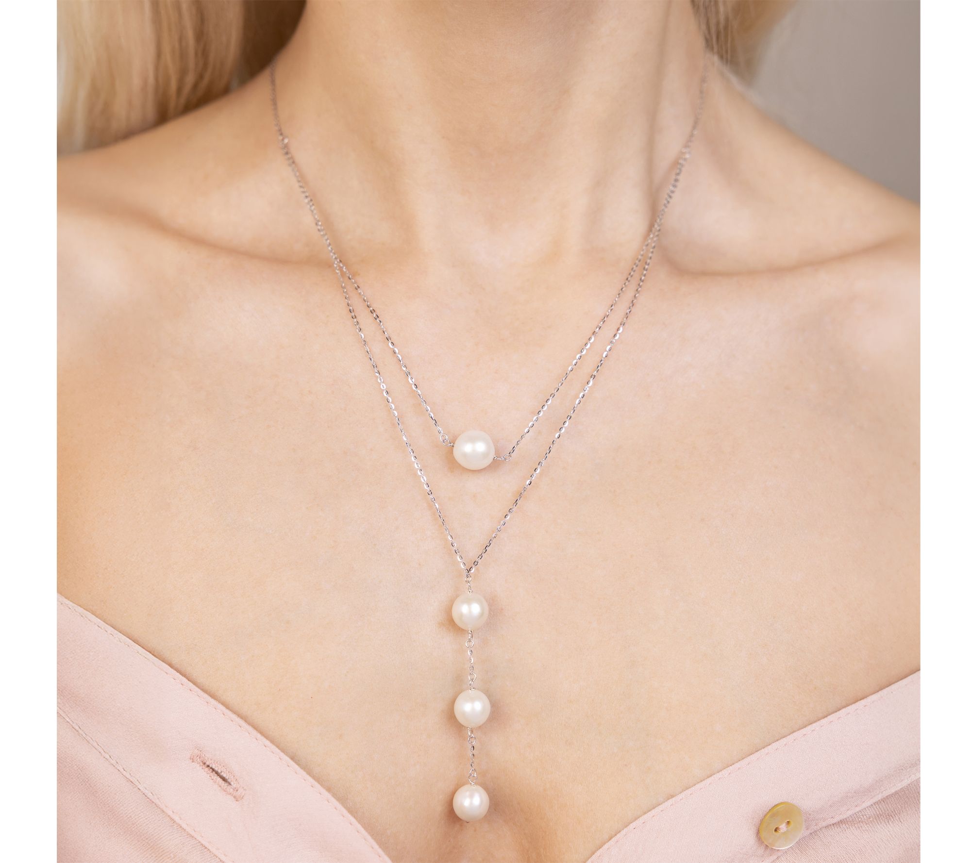 Two attached chain necklaces; oval-shaped cultured freshwater pearls; polished finish