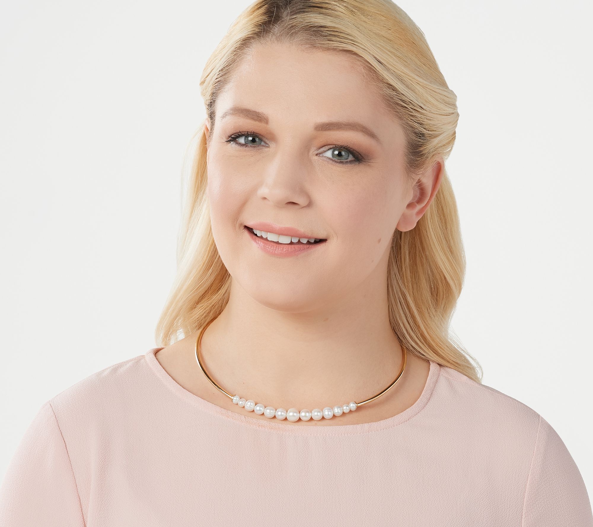 Going gorgeous is easy with this collar necklace. A graduated design of white, ringed cultured freshwater pearls rests at the center. From Honora.