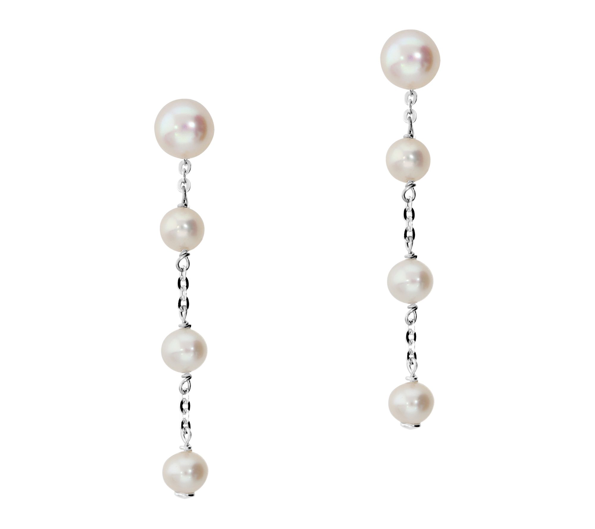 • Linear drop design; round cultured freshwater pearls