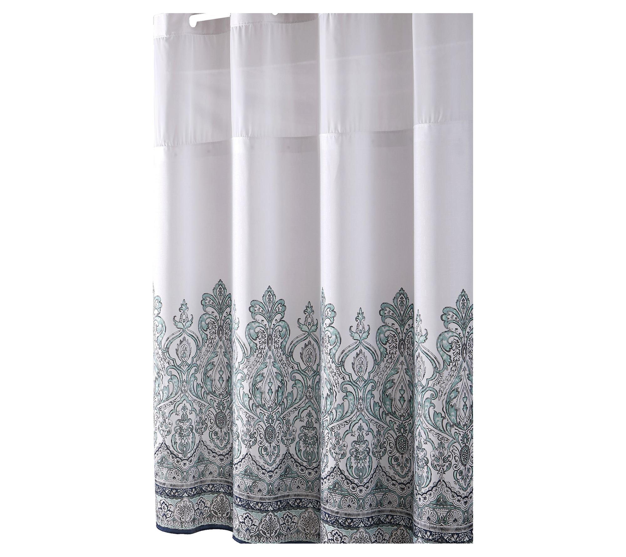 Featuring a beautiful damask border with built-in rings and a durable PEVA liner, this shower curtain is ready to bring a big splash of elegance to your bathroom. From Hookless.