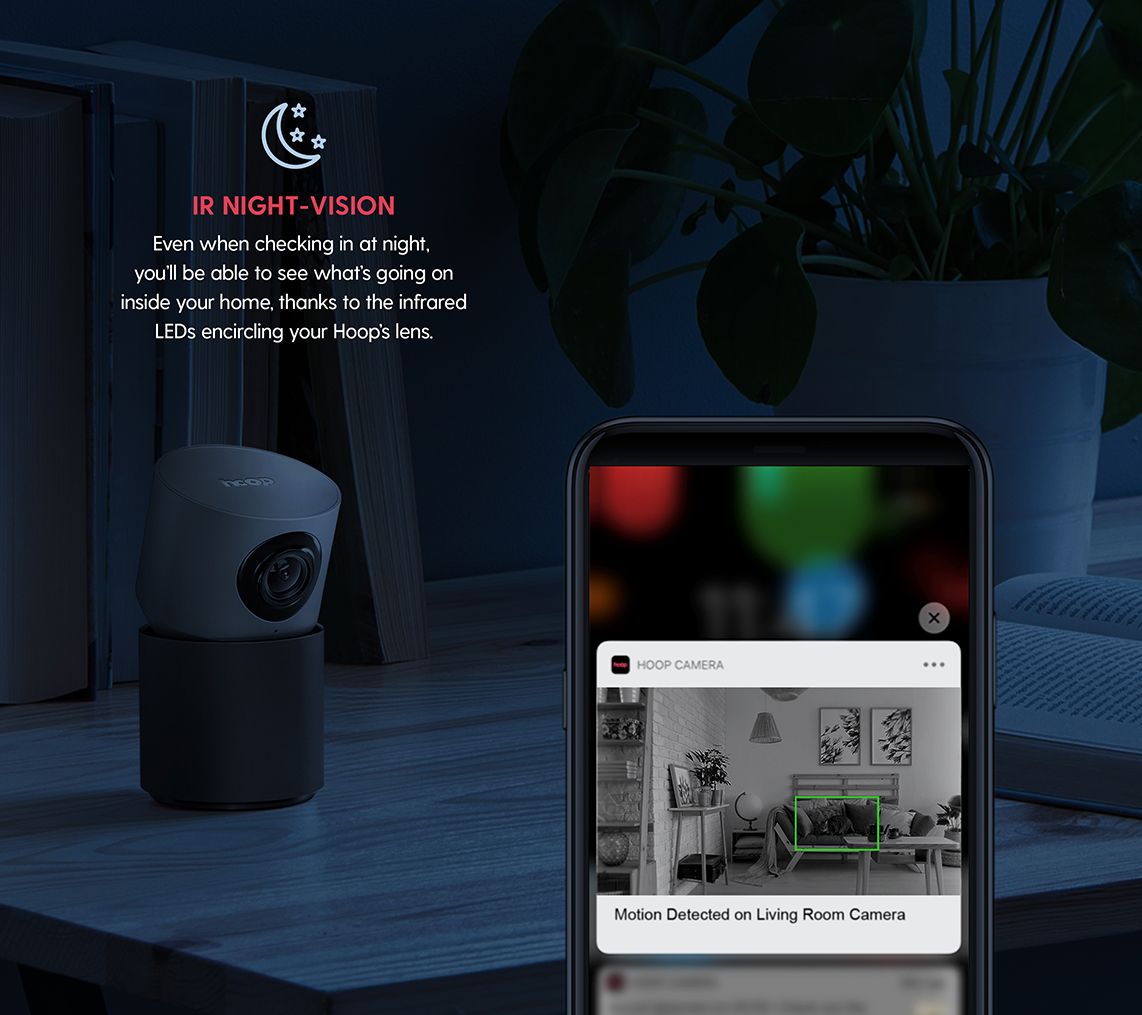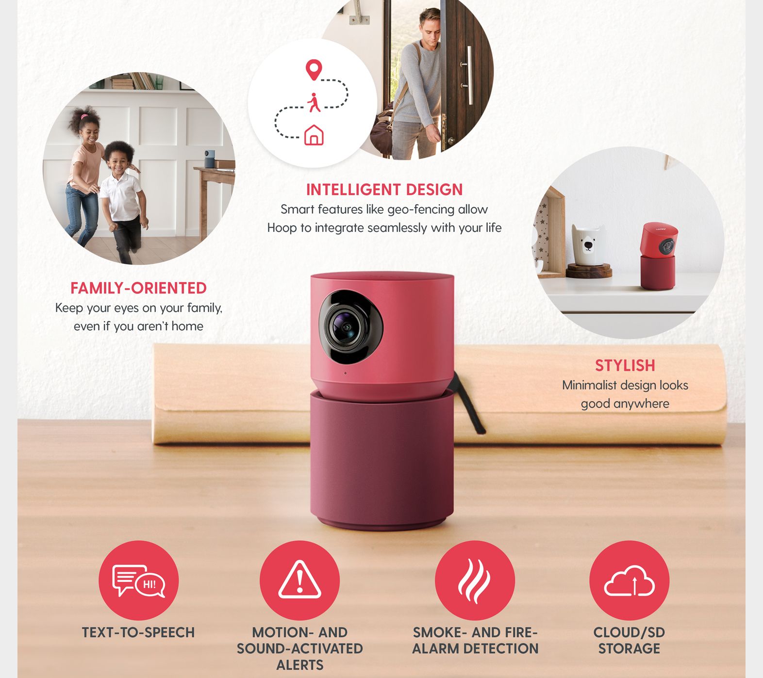 Meet the Hoop -- a clever little security camera designed to help keep you and your family in the loop and on track, with family-friendly features like real-time communication, relevant notifications, and motion tagging. The Plus model allows includes motorized motion panning and tracking.