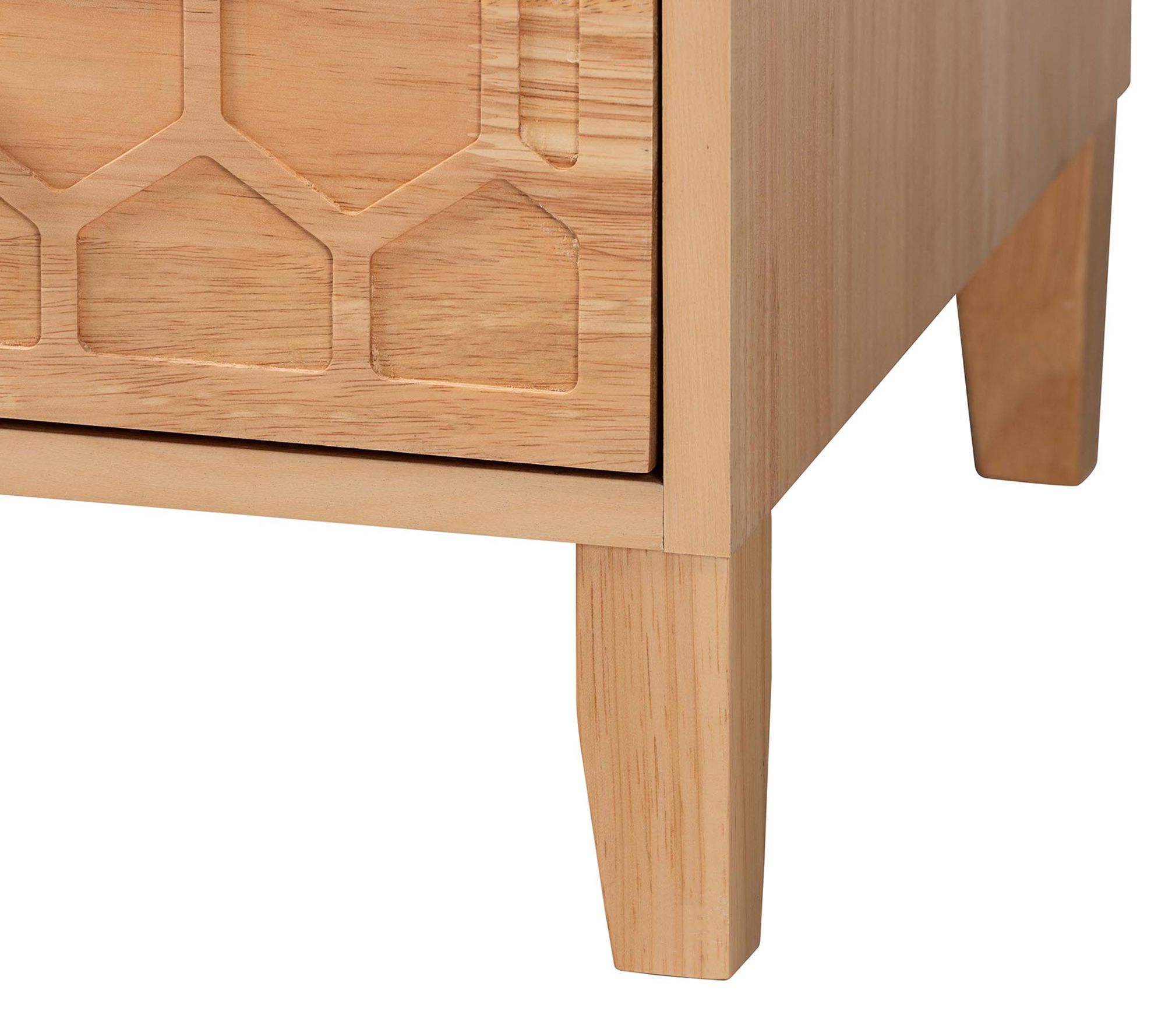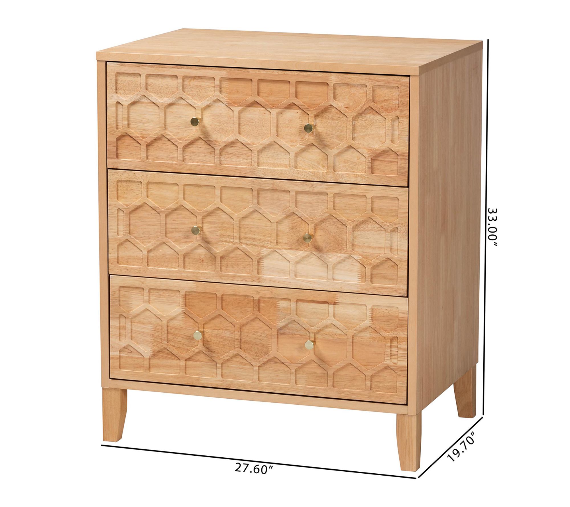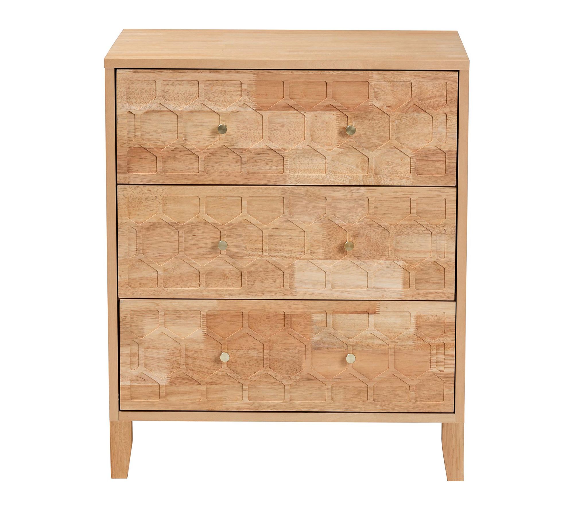 Let soothing style and smart storage make your bedroom feel like a retreat. The Hosea Carved Honeycomb three-drawer chest brings together modern design and artistry with its light wood finish, sturdy construction, and elegantly textured drawer fronts -- giving you space to organize clothes and essentials while adding visual interest to your room. From Baxton Studio.
