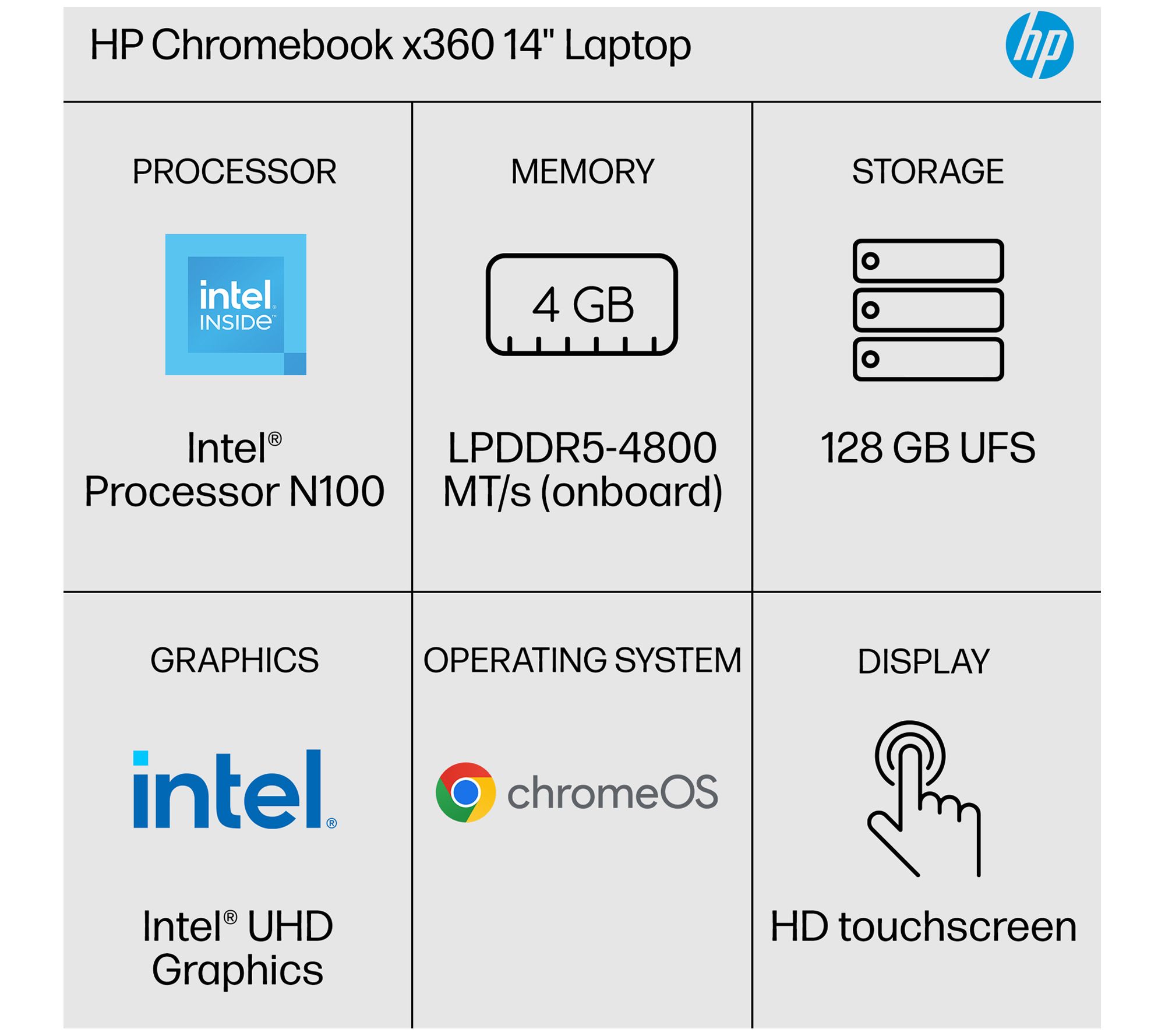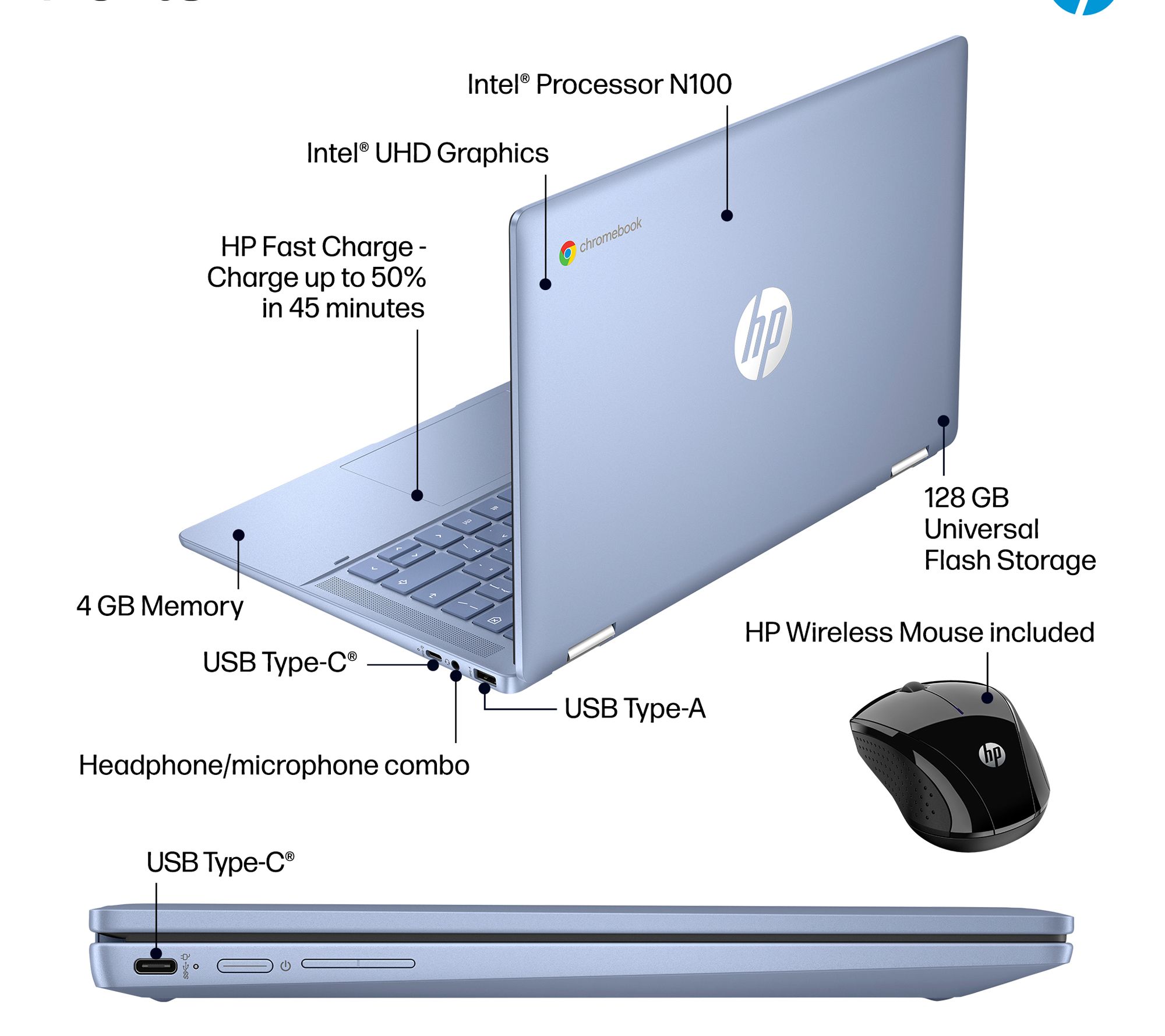 Includes 14b-cd0601ds Chromebook x360 laptop, power adapter, and HP wireless mouse; voucher