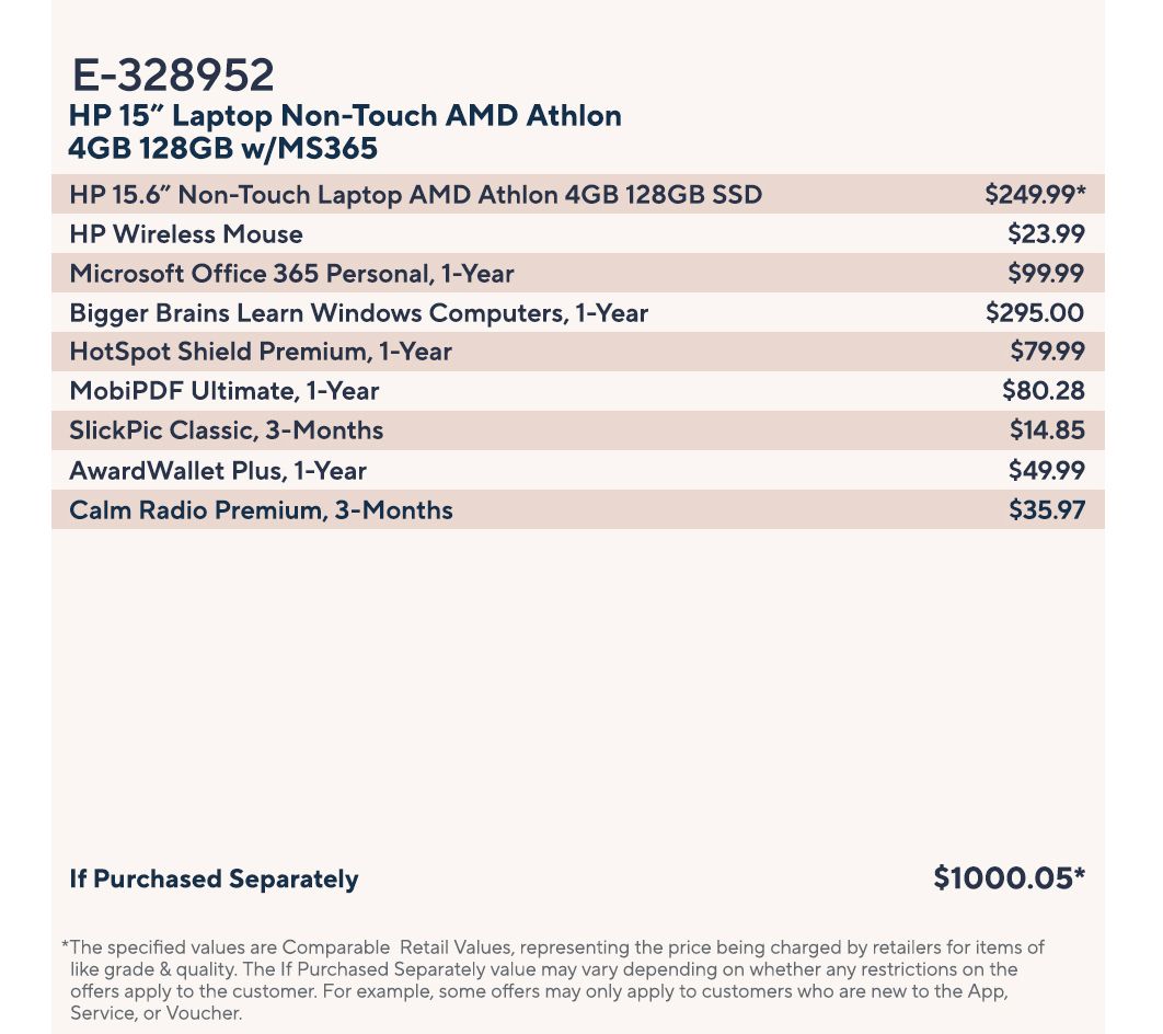 Includes 15-fc0036ds laptop, AC adapter, and HP wireless mouse; voucher