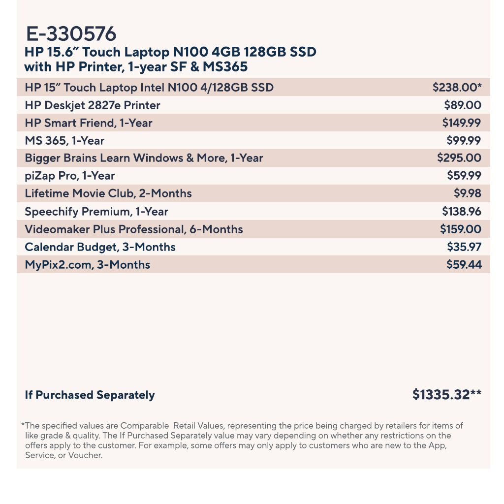 Includes 15-fd0125ds laptop with AC adapter; DeskJet 2827e wireless all-in-one Inkjet printer with HP 67 black ink cartridge, HP 67 tri-color ink cartridge, power cord; HP wireless mouse; voucher